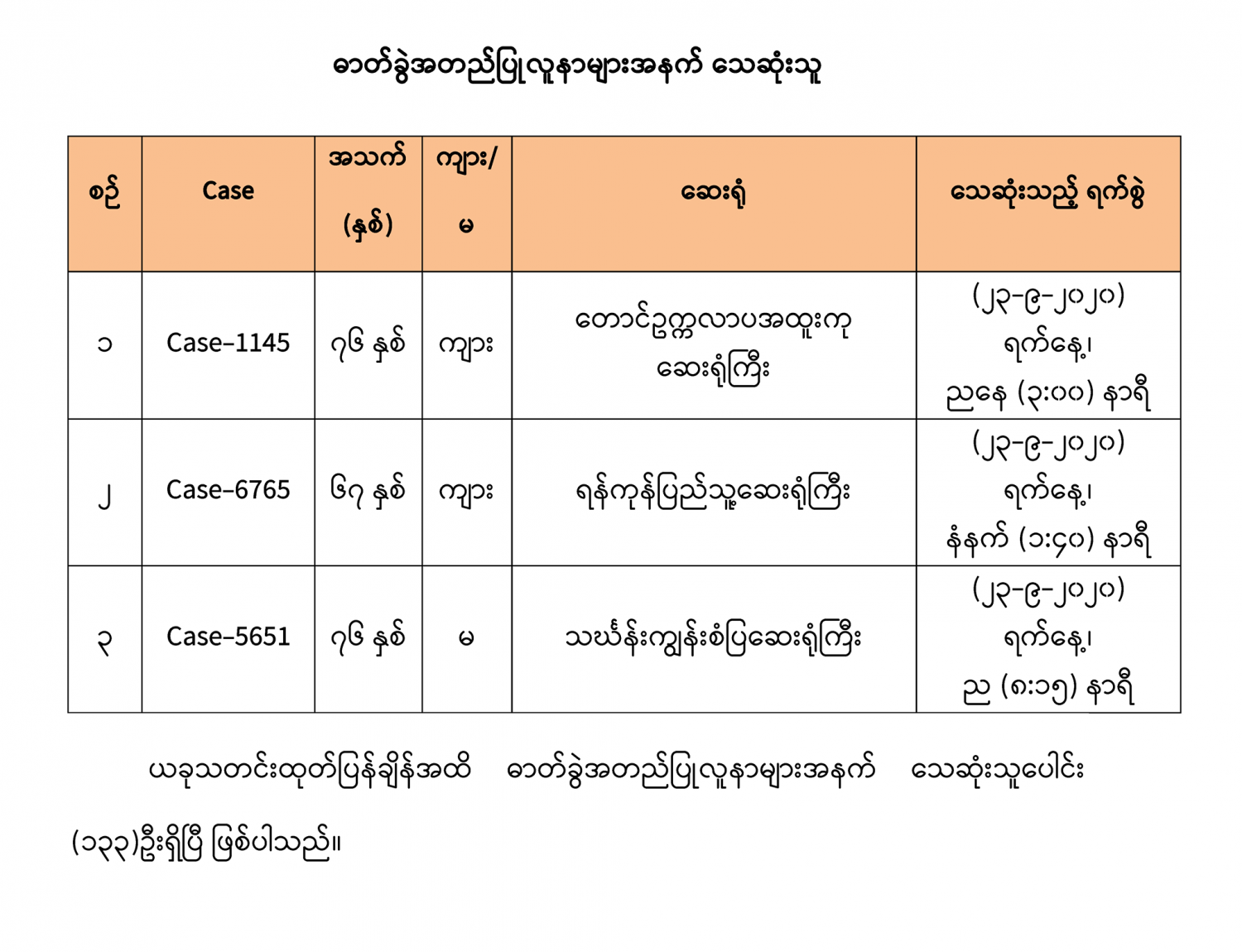 ၃။ (၂၄-၉-၂၀၂၀) ရက်နေ့၊ နံနက် (၈:၀၀) နာရီအထိ ထပ်မံသေဆုံးသူ (၃) ဦး ရှိပါသည်။