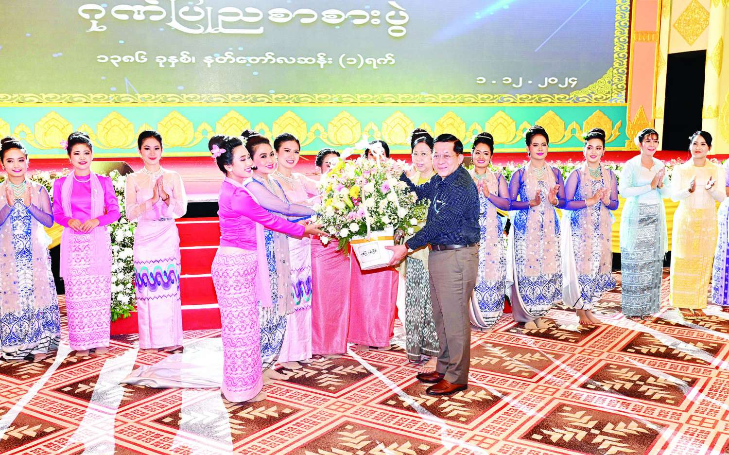ဦးစွာ နိုင်ငံတော်စီမံအုပ်ချုပ်ရေးကောင်စီဥက္ကဋ္ဌ နိုင်ငံတော်ဝန်ကြီးချုပ်နှင့် ဇနီးတို့အား အခမ်းအနားတက်ရောက်လာကြသူများက ကြိုဆိုနှုတ်ဆက်ကြသည်။