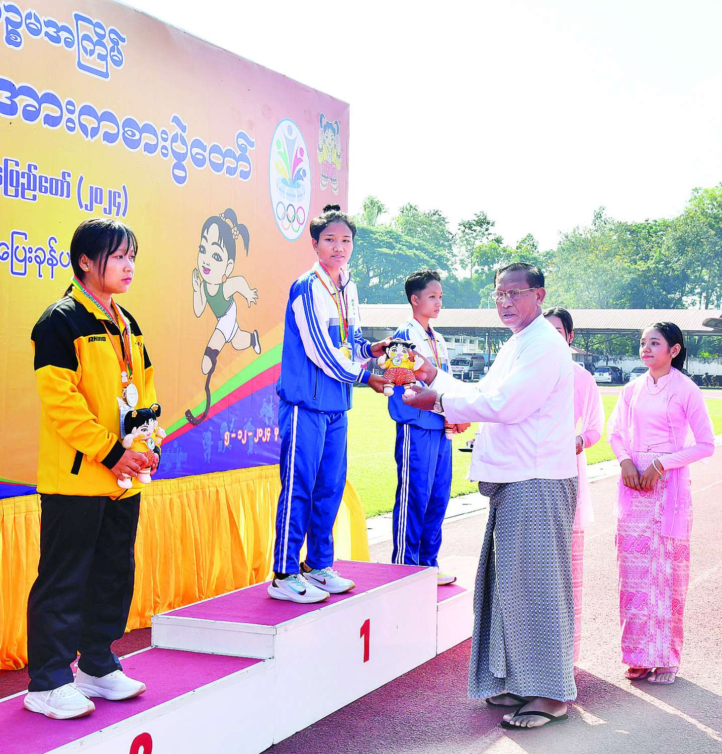 ထို့နောက် နိုင်ငံတော်စီမံအုပ်ချုပ်ရေးကောင်စီအဖွဲ့ဝင် ပိုးရယ်အောင်သိန်းက အမျိုးသမီးအလျားခုန် T44/64 ပြိုင်ပွဲတွင် ပထမဆုရရှိသည့် ဧရာဝတီတိုင်းဒေသကြီး၊ ဒုတိယဆုရရှိသည့် မွန်ပြည်နယ်နှင့် တတိယဆုရရှိသည့် ဧရာဝတီတိုင်းဒေသကြီးတို့မှ ပြိုင်ပွဲဝင်များကိုလည်းကောင်း၊ နိုင်ငံတော်စီမံအုပ်ချုပ်ရေးကောင်စီအဖွဲ့ဝင် မန်းငြိမ်းမောင်က အမျိုးသားသံပြားပစ် F64 ပြိုင်ပွဲတွင် ပထမဆုရရှိသည့် ပဲခူးတိုင်းဒေသကြီး၊ ဒုတိယဆုနှင့် တတိယဆုရရှိသည့် မန္တလေးတိုင်းဒေသကြီးတို့မှ ပြိုင်ပွဲဝင်များကိုလည်းကောင်း၊ နိုင်ငံတော်စီမံအုပ်ချုပ်ရေးကောင်စီအဖွဲ့ဝင် ဒေါ်ဒွဲဘူက အမျိုးသားလှံတံပစ် F46 ပြိုင်ပွဲတွင် ပထမဆုနှင့် ဒုတိယဆုရရှိသည့် မွန်ပြည်နယ်နှင့် တတိယဆုရရှိသည့် မန္တလေးတိုင်းဒေသကြီးတို့မှ ပြိုင်ပွဲဝင်များကိုလည်းကောင်း ဂုဏ်ပြုဆုတံဆိပ်နှင့် အမျိုးသားအားကစားပွဲတော်အထိမ်းအမှတ်အရုပ်ကို ပေးအပ်ချီးမြှင့်ကြသည်။