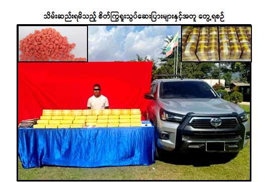 မူးယစ်ဆေးဝါးတားဆီးနှိမ်နင်းရေးရဲတပ်ဖွဲ့မှ တပ်ဖွဲ့ဝင်များပါဝင်သော ပူးပေါင်းအဖွဲ့သည် ဒီဇင်ဘာလ ၅ ရက်နေ့ နံနက် ၉ နာရီခွဲအချိန် ရှမ်းပြည်နယ်(အရှေ့ပိုင်း)၊ မိုင်းဆတ်မြို့နယ်၊ မဟုန်လွယ်ကျေးရွာအနီးတွင် အိုက်ခေးမောင်းနှင်လာသည့် HILUX REVO မော်တော်ယာဉ်ကို သတင်းအရ ရှာဖွေရာယာဉ်ပေါ်မှ ဒေသကာလတန်ဖိုးငွေကျပ်သိန်း ၄,၀၀၀ တန်ဖိုးရှိ စိတ်ကြွရူးသွပ်ဆေးပြား ၁၀ သိန်း သိမ်းဆည်းရမိခဲ့ပြီး စစ်ဆေးဖော်ထုတ်ချက်အရ သိမ်းဆည်းရမိ စိတ်ကြွရူးသွပ်ဆေးပြားများအား တာချီလိတ်မြို့နယ်မှ မိုင်းဆတ်မြို့နယ်သို့ သယ်ဆောင်ရောင်းဝယ်ခြင်းဖြစ်ကြောင်း သိရှိရသဖြင့် ၎င်းအား ဥပဒေအရ အရေးယူထားရှိပြီး ကွင်းဆက်ပြစ်မှုကျူးလွန်သူများအား စစ်ဆေးဖော်ထုတ်လျက်ရှိကြောင်း မြန်မာနိုင်ငံရဲတပ်ဖွဲ့မှ သတင်းရရှိသည်။