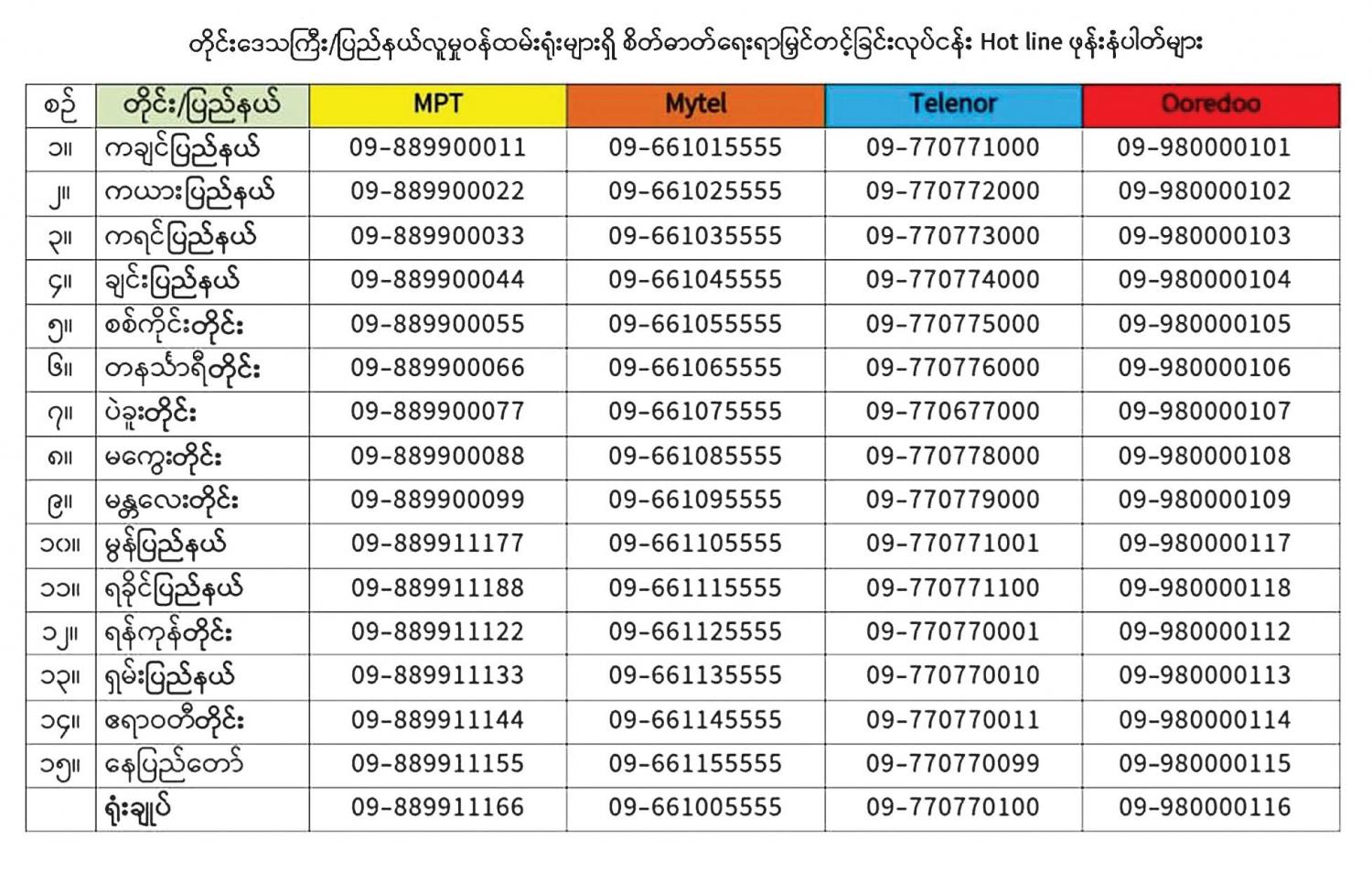 ဝန်ဆောင်မှုရယူမှုသည် အခမဲ့ဖြစ်ပြီး ဆက်သွယ်ရမည့်ဖုန်းနံပါတ်များမှာ ပူးတွဲပါ ဇယားပါအတိုင်း ဖြစ် သည်။