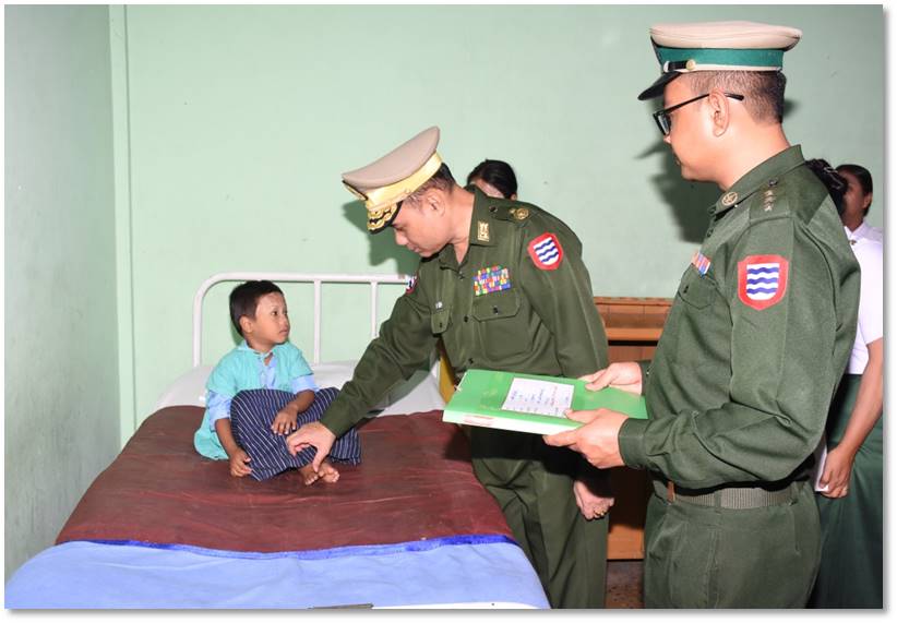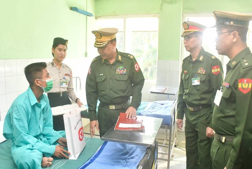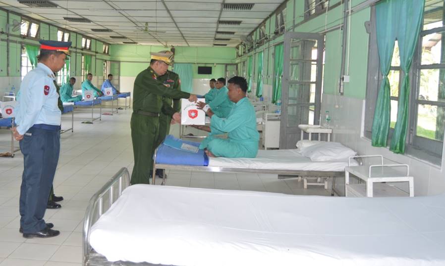ရန်ကုန်တိုင်းဒေသကြီး၊ မင်္ဂလာဒုံမြို့နယ်ရှိ တပ်မတော်အရိုးရောဂါအထူးကု ဆေးရုံကြီး(ခုတင်-၅၀၀)နှင့် တပ်မတော်ဆေးရုံကြီး(ခုတင်-၁၀၀၀) ၊ ဧရာဝတီတိုင်းဒေသကြီး၊ ပုသိမ်မြို့ရှိ နယ်မြေခံဆေးတပ်ရင်း၊ စစ်ကိုင်းတိုင်းဒေသကြီး၊ ကလေးမြို့ရှိ တပ်မတော်ဆေးရုံ၊ ပဲခူးတိုင်းဒေသကြီး၊ တောင်ငူမြို့ရှိ တပ်မတော်ဆေးရုံတို့၌ တက်ရောက်ကုသမှုခံယူလျက်ရှိသော အရာရှိ၊ စစ်သည်၊ မိသားစုများ၊ စစ်မှုထမ်းဟောင်းအဖွဲ့ဝင်များ၊ မြန်မာနိုင်ငံရဲတပ်ဖွဲ့ဝင်များ၊ ပြည်သူ့စစ်(ဌာနေ)တပ်ဖွဲ့ဝင်များနှင့် ဒေသခံပြည်သူများအား ယနေ့တွင် သက်ဆိုင်ရာ တိုင်းစစ်ဌာနချုပ်များမှ တိုင်းမှူးများနှင့် တာဝန်ရှိသူများက သွားရောက်ကြည့်ရှု၍ တစ်ဦးချင်း၏ရောဂါဖြစ်ပွားမှု၊ ဆေးဝါးကုသပေးထားမှုနှင့် ကျန်းမာရေးတိုးတက်ကောင်းမွန်မှု အခြေအနေများကို ရင်းရင်းနှီးနှီးမေးမြန်း အားပေးစကားပြောကြားပြီး စားသောက်ဖွယ်ရာများ ပေးအပ်သည်။