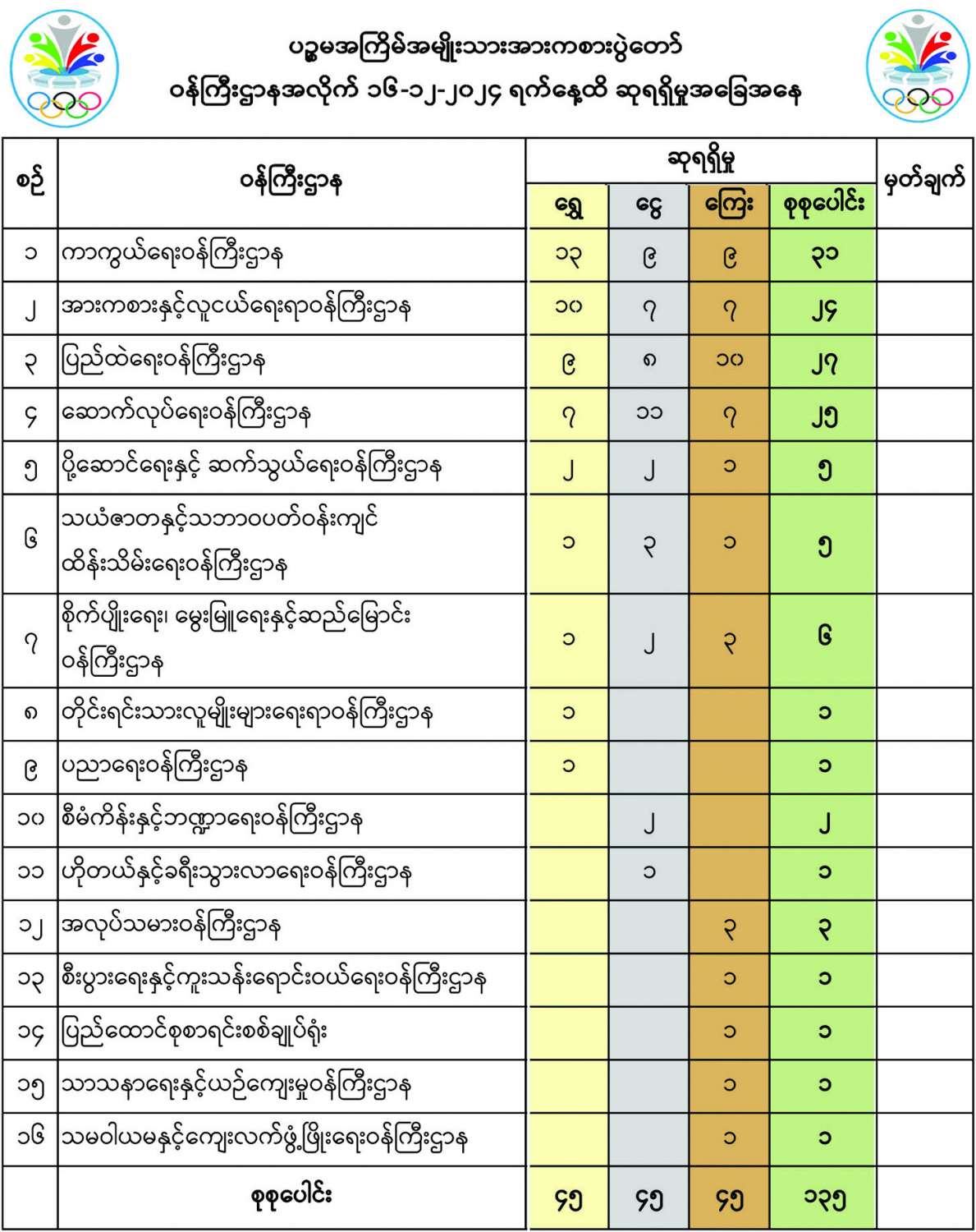 ပဉ္စမအကြိမ် အမျိုးသားအားကစားပွဲတော် ဝန်ကြီးဌာနအလိုက် (၁၆-၁၂-၂၀၂၄) ရက်နေ့ထိဆုရရှိမှုအခြေအနေ 12/17/2024
