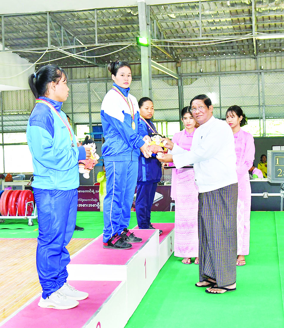 ထို့နောက် ဆုချီးမြှင့်ပွဲ အခမ်းအနားကို ဆက်လက်ကျင်းပရာ ပြည်ထောင်စုဝန်ကြီး ဦးဉာဏ်ထွန်းက အမျိုးသမီး(၅၉)ကီလိုတန်းအလေးမပြိုင်ပွဲတွင် ပထမဆုရရှိသည့် ဧရာဝတီတိုင်းဒေသကြီး၊ ဒုတိယဆုရရှိသည့် စစ်ကိုင်းတိုင်းဒေသကြီးနှင့် တတိယဆုရရှိသည့် ရခိုင်ပြည်နယ်တို့မှ ပြိုင်ပွဲဝင်များကိုလည်းကောင်း၊ အမျိုးသမီး(၆၄)ကီလိုတန်း အလေးမပြိုင်ပွဲတွင် ပထမဆုရရှိသည့် စစ်ကိုင်းတိုင်းဒေသကြီး၊ ဒုတိယဆုရရှိသည့် မကွေးတိုင်းဒေသကြီးနှင့် တတိယဆုရရှိသည့် မန္တလေးတိုင်း ဒေသကြီးတို့မှ ပြိုင်ပွဲဝင်များကိုလည်းကောင်း ဂုဏ်ပြုဆုတံဆိပ်နှင့် အမျိုးသားအားကစားပွဲတော် အထိမ်းအမှတ်အရုပ်များအား ပေးအပ်ချီးမြှင့်ကြသည်။