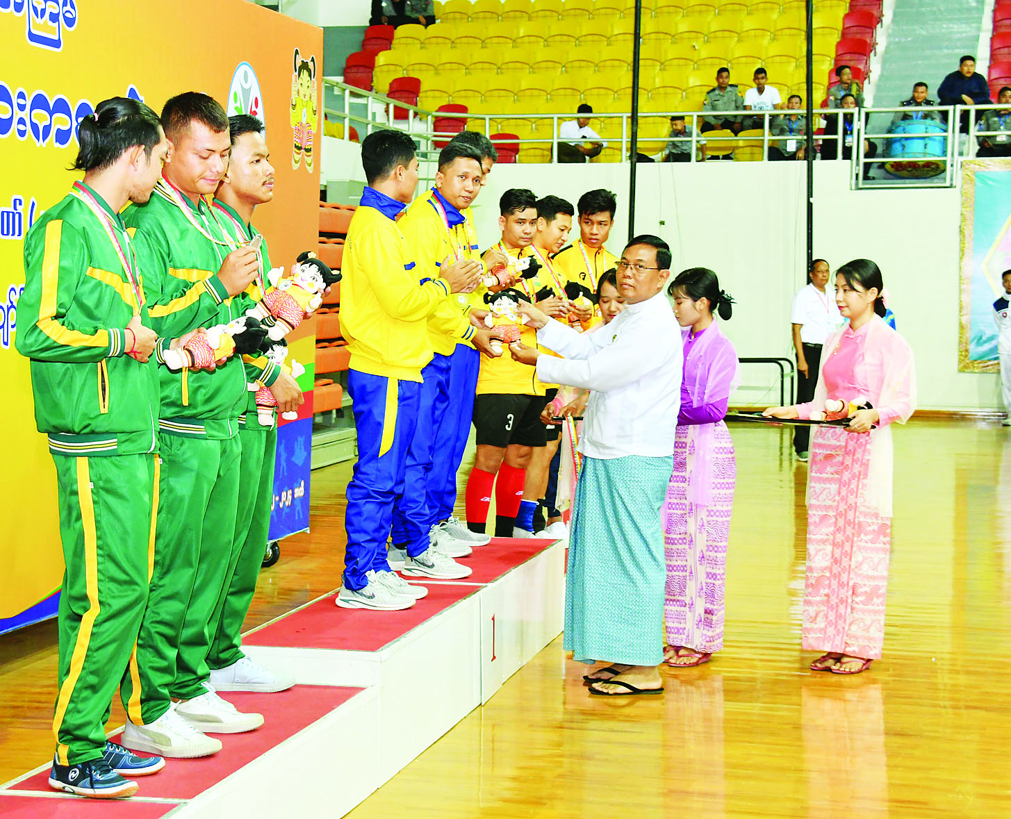 ဆက်လက်၍ ပြည်ထောင်စုဝန်ကြီး ဒုတိယဗိုလ်ချုပ်ကြီး ထွန်းထွန်းနောင်က အမျိုးသားဘော်လီဘောပြိုင်ပွဲတွင် ဒုတိယဆုရရှိသည့် ပြည်ထဲရေးဝန်ကြီး ဌာနအသင်းကိုလည်းကောင်း၊ နိုင်ငံတော်စီမံအုပ်ချုပ်ရေးကောင်စီဝင် ပြည်ထောင်စုဝန်ကြီး ဒုတိယဗိုလ်ချုပ်ကြီး ရာပြည့်က အမျိုးသမီးဘော်လီဘောပြိုင်ပွဲတွင် ပထမဆုရရှိသည့် ကာကွယ်ရေးဝန်ကြီးဌာနအသင်းကိုလည်းကောင်း၊ နိုင်ငံတော်စီမံအုပ်ချုပ်ရေးကောင်စီဝင် ဒုတိယဝန်ကြီးချုပ်နှင့် ပြည်ထောင်စုဝန်ကြီး ဗိုလ်ချုပ်ကြီး မြထွန်းဦးက အမျိုးသားဘော်လီဘောပြိုင်ပွဲတွင် ပထမဆုရရှိသည့် အားကစားနှင့် လူငယ်ရေးရာဝန်ကြီးဌာနအသင်းကိုလည်းကောင်း တစ်ဦးချင်းဂုဏ်ပြုဆုတံဆိပ်နှင့် အမျိုးသားအားကစားပွဲတော် အထိမ်းအမှတ်အရုပ်များ ပေးအပ်ချီးမြှင့်ကြသည်။