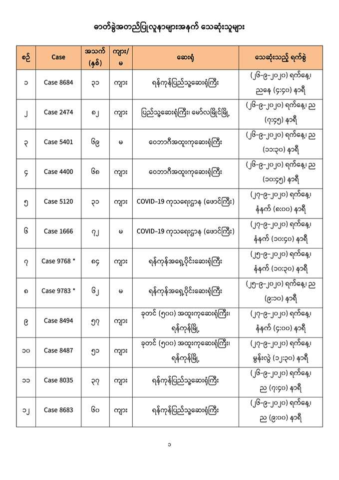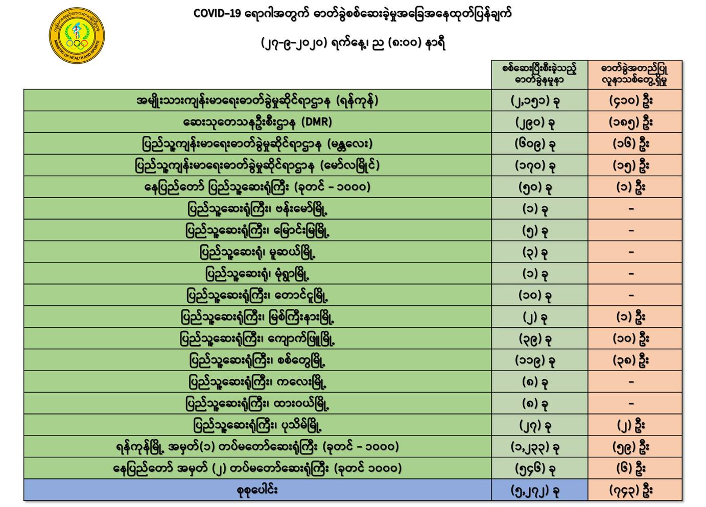 ၁။ (၂၆-၉-၂၀၂၀) ရက်နေ့၊ ည (၈:၀၀)နာရီမှ (၂၇-၉-၂၀၂၀) ရက်နေ့၊ ည (၈:၀၀)နာရီအတွင်း ဓာတ်ခွဲနမူနာ စုစုပေါင်း (၅,၂၇၂) ခုအား စစ်ဆေးပြီးစီးခဲ့ရာ -