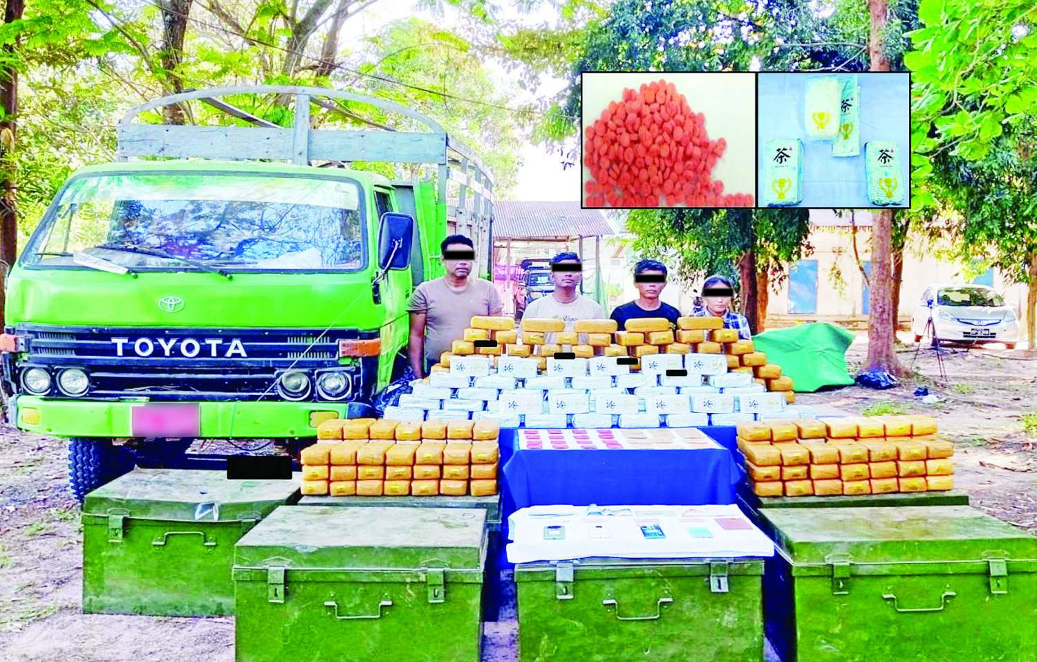 မူးယစ်ဆေးဝါးတားဆီးနှိမ်နင်းရေးရဲတပ်ဖွဲ့မှ တပ်ဖွဲ့ဝင်များ ပါဝင်သော ပူးပေါင်းအဖွဲ့သည် ဒီဇင်ဘာ ၂၀ တွင် ပဲခူးမြို့ ရပ်ကွက်ကြီး (၆) ဗိုလ်အောင်ကျော်လမ်း၌ ကျော်ဆန်းဦး မောင်းနှင်ပြီး မလွမ်းယန်းလိုက်ပါလာသည့် TOYOTA DYNA မော်တော်ယာဉ်ကို သတင်းအရ ရှာဖွေရာ ဒေသကာလတန်ဖိုးငွေကျပ် ၁၄ ဒသမ ၁၁၅၄ ဘီလီယံတန်ဖိုးရှိ စိတ်ကြွရူးသွပ်ဆေးပြား ၅၂ ဒသမ ၃ သိန်း၊ အိုက်စ် (မက်သ်အဖက်တမင်း) ၁၇၀ ကီလိုနှင့် Happy Water ၂ ဒသမ ၆၇ ကီလို တို့ကို သိမ်းဆည်းရမိခဲ့ပြီး စစ်ဆေးဖော်ထုတ်ချက်အရ ယင်းနေ့ညနေ ၆ နာရီတွင် စိတ်ပြောင်း ဆေးဝါးများ သယ်ဆောင်ခိုင်းသူများဖြစ်သည့် နိုင်နိုင်ဝင်း (ခ) ရှက်ဖီးနှင့် တင်ထွန်းနိုင်တို့အား ပဲခူးမြို့ ရပ်ကွက်ကြီး (၆)၊ ဗိုလ်အောင်ကျော်လမ်းရှိ ဟိုတယ်တွင် ဆက်လက် ဖမ်းဆီးရမိခဲ့ကြောင်း၊ စစ်ဆေးဖော်ထုတ်ချက်များအရ ဖမ်းဆီးရမိ စိတ်ပြောင်းဆေးဝါးများကို ရှမ်းပြည်နယ်(တောင်ပိုင်း) နမ့်စန်မြို့မှ ပဲခူးမြို့သို့ သယ်ဆောင်ပြီး ၎င်းမှတစ်ဆင့် ရန်ကုန်တိုင်းဒေသကြီး၊ ရခိုင်ပြည်နယ်နှင့် ကရင် ပြည်နယ်တို့သို့ သယ်ဆောင်ရောင်းဝယ်ခြင်းဖြစ်ကြောင်း သိရှိရသဖြင့် ၎င်းတို့အား ဥပဒေအရ အရေးယူထားရှိပြီး ကွင်းဆက်ပြစ်မှုကျူးလွန်သူများအား ဆက်လက် စစ်ဆေးဖော်ထုတ်လျက်ရှိကြောင်း သတင်းရရှိသည်။
