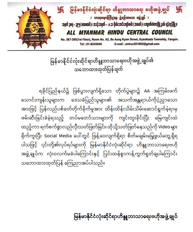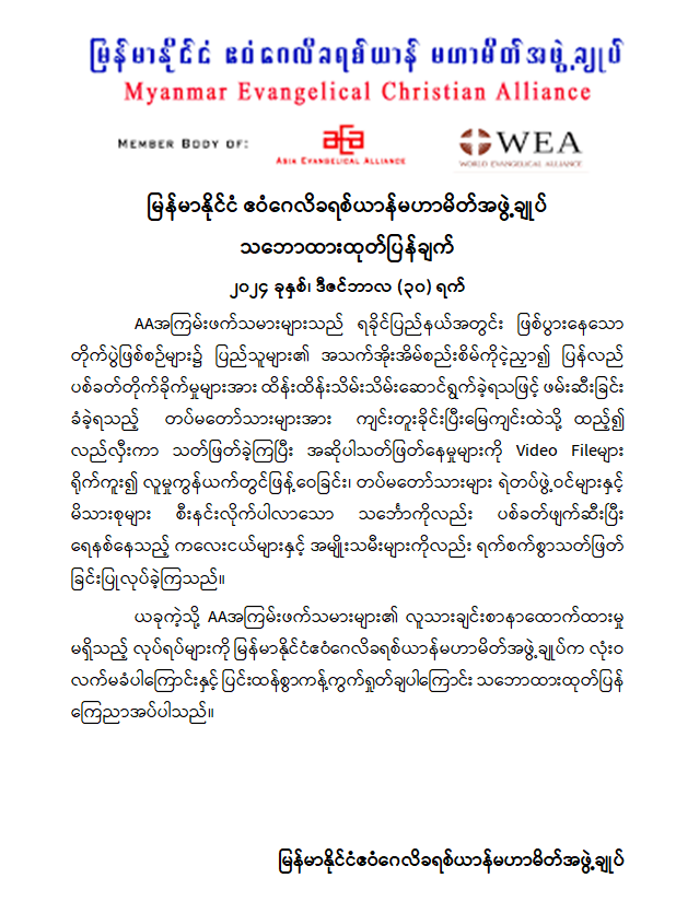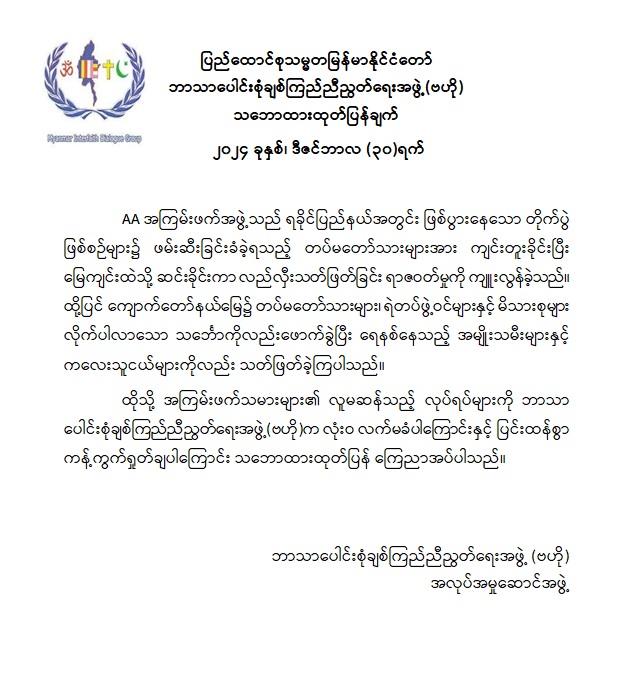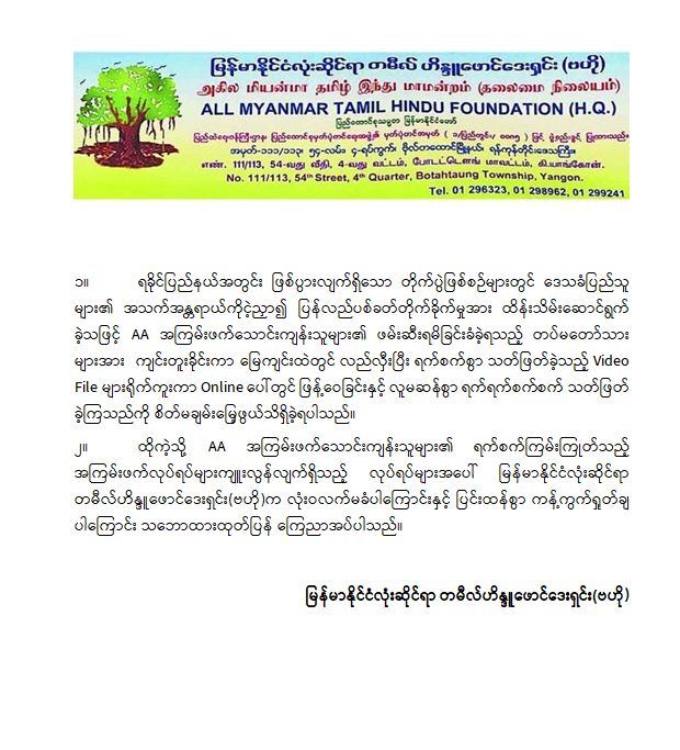 ယခုကဲ့သို့ AA အကြမ်းဖက်သောင်းကျန်းသူအဖွဲ့၏ စစ်ရာဇဝတ်မှု(War Crime) မြောက်သည့် လူမဆန်စွာရက်စက် ယုတ်မာရိုင်းစိုင်းသော အကြမ်းဖက်လုပ်ရပ်များအပေါ် မည်သို့မျှ လက်ခံနိုင်ဖွယ်ရာမရှိသည့်အတွက် ဗုဒ္ဓဘာသာကလျာဏယုဝအသင်း YMBA(ဗဟို)၊ ဘာသာပေါင်းစုံချစ်ကြည်ညီညွတ်ရေးအဖွဲ့(ဗဟို)၊ မြန်မာနိုင်ငံဧဝံဂေလိ ခရစ်ယာန်မဟာမိတ်အဖွဲ့ချုပ်၊ ပြည်ထောင်စုမြန်မာနိုင်ငံမက်သဒစ်အသင်းတော် (အောက်မြန်မာပြည်)၊ ယုံကြည်ခြင်းဧဝံဂေလိအသင်းတော်(ပဲခူး)၊ လွတ်မြောက်ခြင်းအသင်းတော်(ရန်ကုန်)၊ မြန်မာနိုင်ငံလုံးဆိုင်ရာဟိန္ဒူဘာသာရေးဗဟိုအဖွဲ့ချုပ်၊ မြန်မာနိုင်ငံလုံးဆိုင်ရာတမီလ်ဟိန္ဒူဖောင်ဒေးရှင်း(ဗဟို)၊ သနန္တဓမ္မပါလက(ဟိန္ဒူ)အဖွဲ့ချုပ်၊ မြန်မာနိုင်ငံလုံးဆိုင်ရာအစ္စလာမ်ဘာသာရေးအဖွဲ့ကြီး၊ မြန်မာနိုင်ငံသတင်းမီဒီယာကောင်စီ၊ မြန်မာနိုင်ငံစာရေးဆရာအသင်း၊ မြန်မာနိုင်ငံရုပ်ရှင်အစည်းအရုံး၊ မြန်မာနိုင်ငံဂီတအစည်းအရုံး(ဗဟို)၊ မြန်မာနိုင်ငံပန်းချီပန်းပုအစည်းအရုံး(ဗဟို)၊ မြန်မာနိုင်ငံသဘင်အစည်းအရုံး(ဗဟို)၊ မြန်မာနိုင်ငံဟာသပညာရှင်များအစည်းအရုံး၊ မြန်မာနိုင်ငံအားကစားမီဒီယာများအဖွဲ့ချုပ်နှင့် ပိန္နဲကုန်းရခိုင်ဂျာမေဗလီတို့မှ ပြင်းထန်စွာ ကန့်ကွက်ရှုတ်ချပါကြောင်း သဘောထားများ အသီးသီးထုတ်ပြန်ခဲ့ကြကြောင်း သတင်းရရှိသည်။