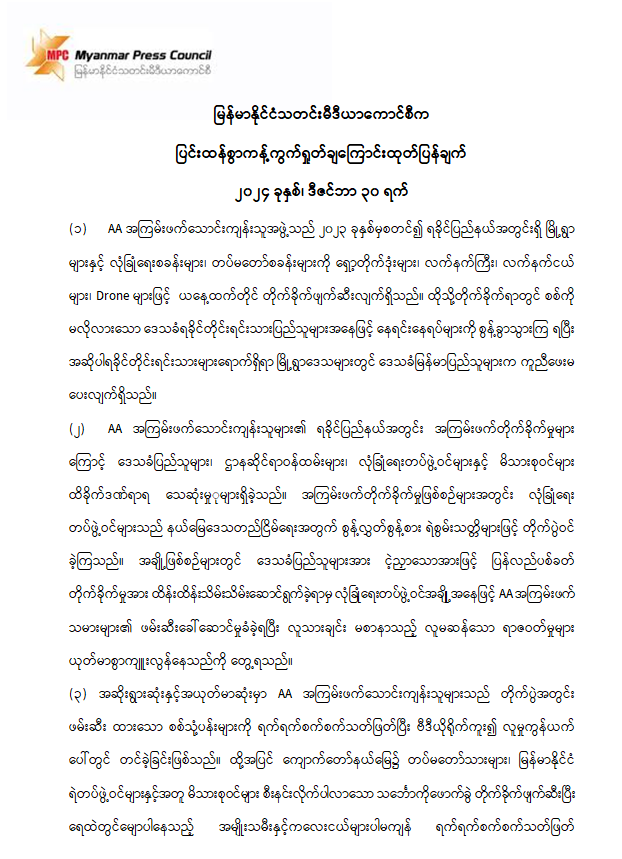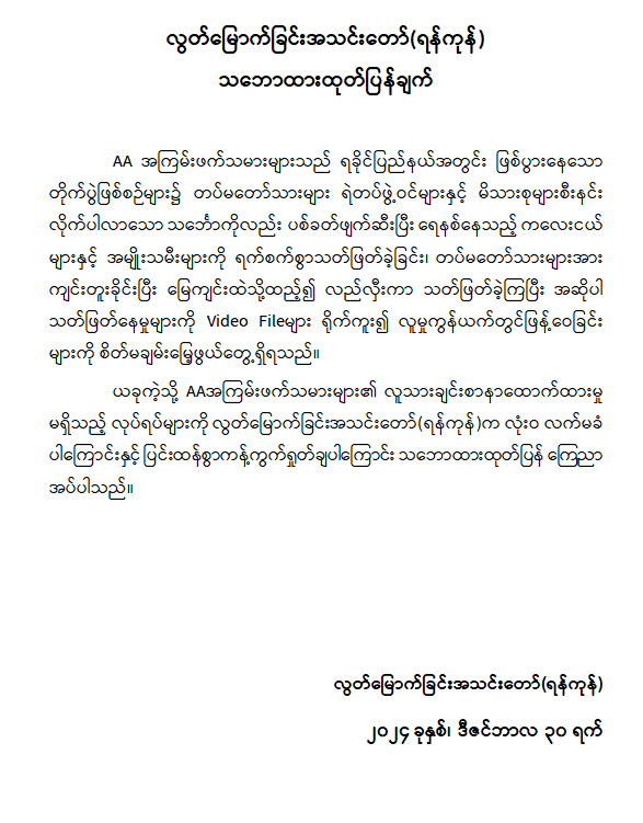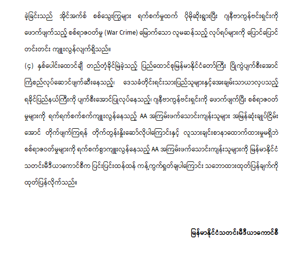 ရခိုင်ပြည်နယ်အတွင်း ဖြစ်ပွားလျက်ရှိသော တိုက်ပွဲဖြစ်စဉ်များ၌ ဒေသခံပြည်သူများ၏ အသက်အန္တရာယ်ကိုငဲ့ညှာ၍ ပြန်လည်ပစ်ခတ်တိုက်ခိုက်မှုအား ထိန်းသိမ်းဆောင်ရွက်ခဲ့ရသဖြင့် ဖမ်းဆီးခြင်းခံခဲ့ရသည့် တပ်မတော်သားများအား AA အကြမ်းဖက်သောင်းကျန်းသူများက ကျင်းတူးခိုင်းပြီး မြေကျင်းထဲသို့ထည့်၍ လည်လှီးကာသတ်ဖြတ်ခြင်း၊ အဆိုပါလည်လှီးသတ်ဖြတ်နေသည့် Video File များကို ရိုက်ကူး၍ Online ပေါ်တွင် ဖြန့်ဝေခြင်း ပြုလုပ်လျက်ရှိသည်။ ထို့ပြင် ကျောက်တော်နယ်မြေ၌လည်း တပ်မတော်သားများ ရဲတပ်ဖွဲ့ဝင်များနှင့် မိသားစုများလိုက်ပါလာသော သင်္ဘောကိုလည်း ပစ်ခတ်ဖောက်ခွဲ၍ ရေနစ်နေသည့် အမျိုးသမီးများနှင့် ကလေးငယ်များကိုလည်း ရက်ရက်စက်စက် သတ်ဖြတ်ခဲ့ကြသည်။