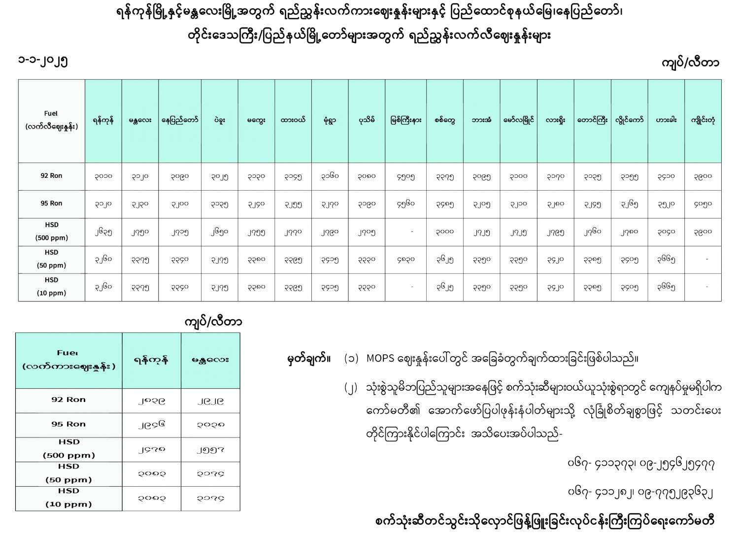 ရန်ကုန်မြို့နှင့် မန္တလေးမြို့အတွက် ရည်ညွှန်းလက်ကားဈေးနှုန်းများနှင့် ပြည်ထောင်စုနယ်မြေ နေပြည်တော်၊ တိုင်းဒေသကြီး/ပြည်နယ် မြို့တော်များအတွက် ရည်ညွှန်းလက်လီဈေးနှုန်းများ 01/01/2025