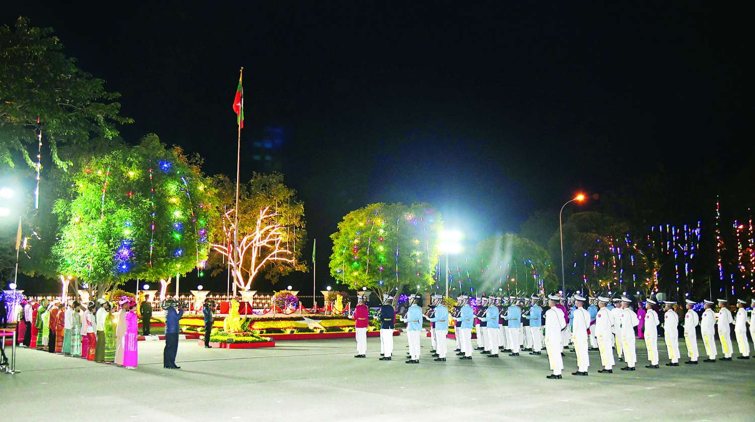 ရှေးဦးစွာ နံနက် ၄ နာရီ မိနစ် ၂၀ တွင် ၂၀၂၅ ခုနှစ်၊ (၇၇)နှစ်မြောက် လွတ်လပ်ရေးနေ့ နိုင်ငံတော်အလံတင် အခမ်းအနားကိုကျင်းပရာ အလံတင်တပ်စုက တိုင်းရင်းသား၊ တိုင်းရင်းသူများခြံရံ၍ နိုင်ငံတော်အလံကို လွှင့်တင်သည်။