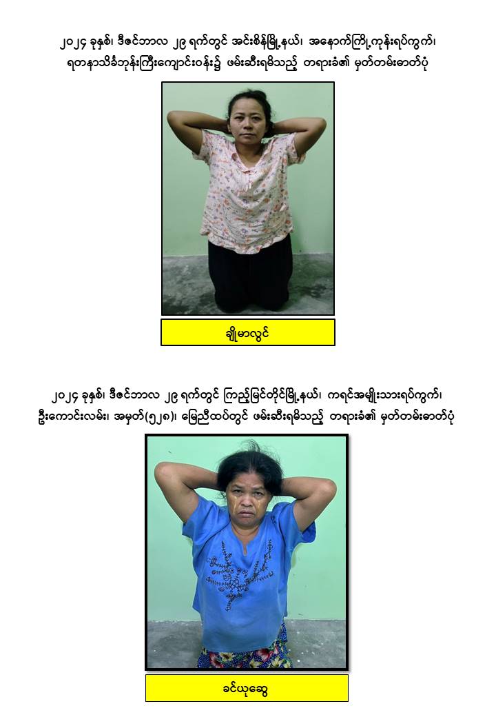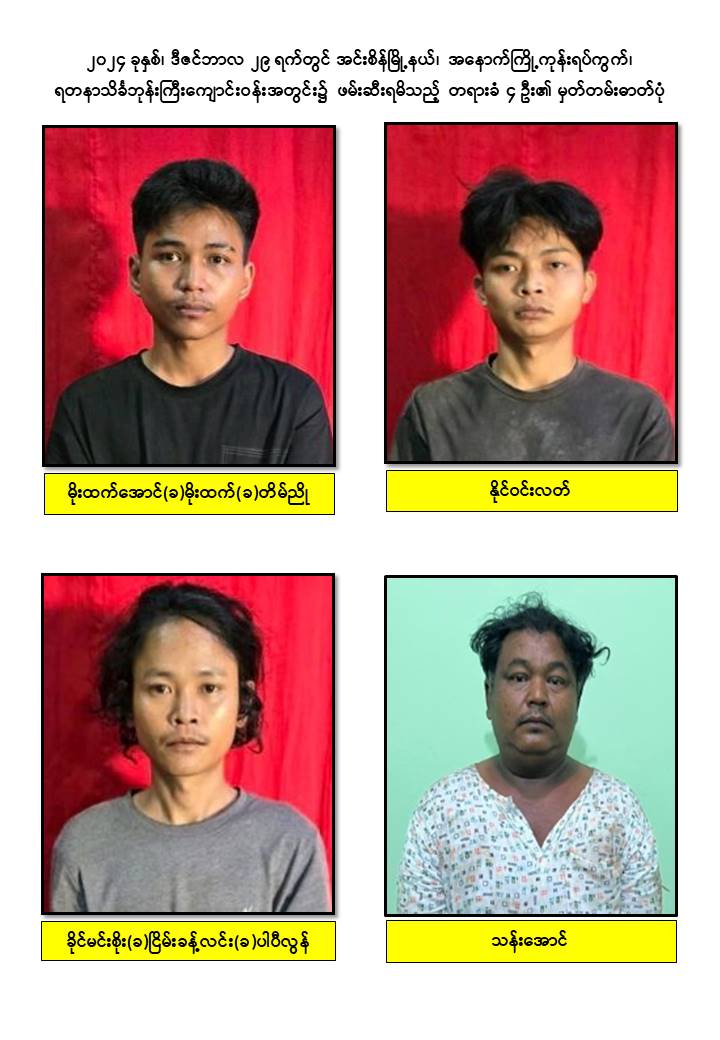 သို့ဖြစ်၍ ဖမ်းဆီးရမိတရားခံများအား ဥပဒေအရထိရောက်စွာအရေးယူနိုင်ရေး ဆက်လက်ဆောင်ရွက်သွားမည်ဖြစ်ပြီး အကြမ်းဖက်မှုဆောင်ရွက်နေသူများအား ပြည်သူတစ်ရပ်လုံးက ဝိုင်းဝန်းကာကွယ်တိုက်ဖျက်ကြရန်နှင့် ဆက်စပ်တရားခံများအား အမြန်ဆုံးဖမ်းဆီးရမိရေးအတွက် ၎င်းတို့ပုန်းခိုရာနေရာများ၊ လှုပ်ရှားသွားလာနေထိုင်မှု သတင်းများရရှိပါက သက်ဆိုင်ရာသို့ လျှို့ဝှက်စွာ သတင်းပေးတိုင်ကြားနိုင်ပါကြောင်း၊ သတင်းပေးသူနှင့် ဖမ်းဆီးပေးသူများအား ထိုက်တန်စွာလျှို့ဝှက်၍ ဆုငွေများချီးမြှင့်ပေးလျက်ရှိကြောင်းနှင့် မြို့ရွာများအမြန်ဆုံး အေးချမ်းတည်ငြိမ်ရေးအတွက် ပြည်သူတစ်ရပ်လုံး ပူးပေါင်းပါဝင်ကြိုးပမ်းဆောင်ရွက်နိုင်ပါရန် မေတ္တာရပ်ခံအပ်ပါကြောင်း အသိပေးသတင်းထုတ်ပြန်အပ်ပါသည်။