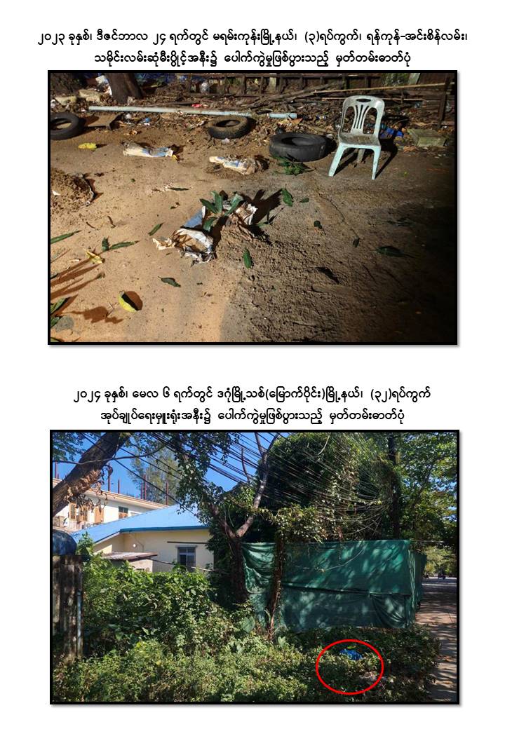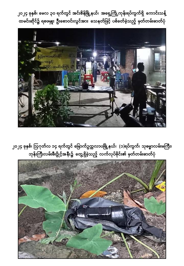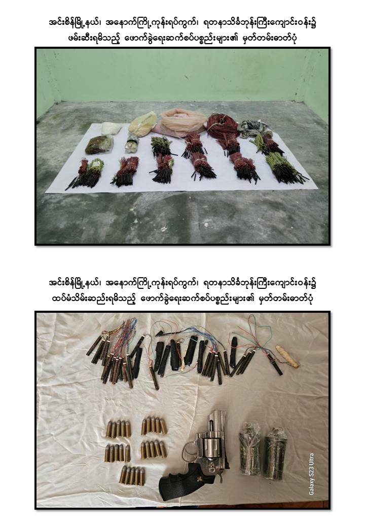 ဖြစ်စဉ်တွင် ရန်ကုန်တိုင်းဒေသကြီးအတွင်း အကြမ်းဖက်လုပ်ငန်းများ ဆောင်ရွက်လျက်ရှိသည့် တရားခံ ကျား ၅ ဦး၊ မ ၂ ဦး၊ စုစုပေါင်း ၇ ဦးတို့အား Sig Sauer ပစ္စတို သေနတ် ၂ လက်၊ ၎င်းကျည်အိမ် ၃ ခု၊ 9mm ကျည် ၂၄ တောင့်၊ ပွိုင့် 38 Special အမျိုးအစား ခြောက်လုံးပြူးသေနတ် ၁ လက်၊ ၎င်းကျည် ၂၅ တောင့်၊ လက်လုပ်ဗုံး ၂ လုံး၊ TNT ယမ်းတောင့် ၂ တောင့်၊ ဒီတိုနေတာ ၅၃၅ ချောင်း၊ ယမ်းမှုန့် ၃ ပိဿာ ၅ဝ ကျပ်သား၊ နိုက်ထရိုကလယ်ဇင်း ၅ဝ ကျပ်သား၊ ပုလဲ ၅ဝ ပိဿာ၊ Black Powder ၂ဝ ကျပ်သား၊ ယမ်းကြိုး(၂ဝဝ ပေ) ၁ ခွေ၊ ဖောက်ခွဲရေးဆက်စပ်ပစ္စည်းများနှင့်အတူ ဖမ်းဆီးရမိခဲ့သည်။