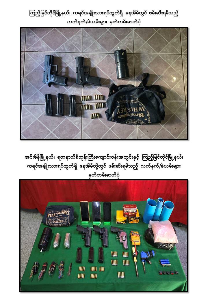 ဖမ်းဆီးရမိတရားခံများ၏ ထွက်ဆိုချက်အရ ပြစ်မှုကျူးလွန်စဉ်က အသုံးပြုခဲ့သော လက်နက်/ ခဲယမ်းများအား ကြည့်မြင်တိုင်မြို့နယ်၊ ကရင်အမျိုးသားရပ်ကွက်၊ ဦးကောင်းလမ်း၊ အမှတ်(၅၂၈)၊ (မြေညီထပ်)အခန်းတွင် နေထိုင်သည့် ဖမ်းဆီးရန်ကျန် တရားခံများဖြစ်သည့် စွမ်းထက်(ခ)အေရွန်နှင့် ဇွန်ပွင့်ဖြူတို့ထံတွင် သိမ်းဆည်းထားကြောင်းသိရှိရသဖြင့် အဆိုပါနေ့ နေ့လယ်ပိုင်းတွင် သွားရောက်ရှာဖွေခဲ့ရာ ၎င်းတို့ ၂ ဦးမှာ ထွက်ပြေးတိမ်းရှောင်သွားခဲ့ပြီး ဖမ်းဆီးရန်ကျန် တရားခံ စွမ်းထက်(ခ) အေရွန်၏ မိခင်ဖြစ်သူ ခင်ယုဆွေအား နေအိမ်မီးဖိုခန်းအတွင်းမှ Sig Sauer ပစ္စတိုသေနတ် ၂ လက်၊ ကျည်အိမ် ၃ ခု၊ 9mm Thai Arms ကျည် ၁၅ တောင့်၊ 9mm Luger ကျည် ၉ တောင့်၊ လက်လုပ်ဗုံး ၁ လုံးတို့နှင့်အတူ ထပ်မံဖမ်းဆီးရမိခဲ့သည်။