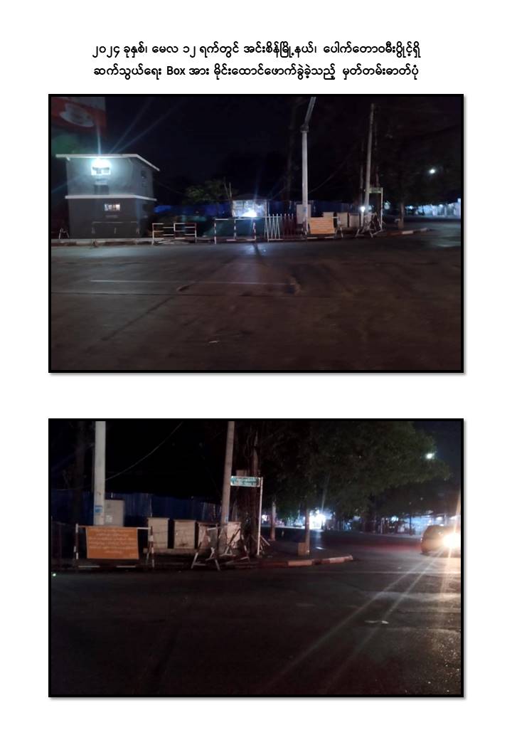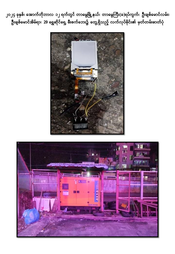မေလ ၁၂ ရက်တွင် အင်းစိန်မြို့နယ်၊ ပေါက်တောဝမီးပွိုင့်ရှိ ဆက်သွယ်ရေး Box အား ခိုင်မင်းစိုး(ခ)ငြိမ်းခန့်လင်း(ခ)ပါပီလွန်နှင့် မိုးထက်အောင်(ခ)မိုးထက်(ခ) တိမ်ညိုတို့ ၂ ဦးမှ လက်လုပ်ရီမုမိုင်းဖြင့် ဖောက်ခွဲခဲ့ပြီး ဖမ်းဆီးရန်ကျန် တရားခံခင်ဇော်ဝင်းမှ အခြေအနေကြည့်ရှုပေးခဲ့ကြောင်း။