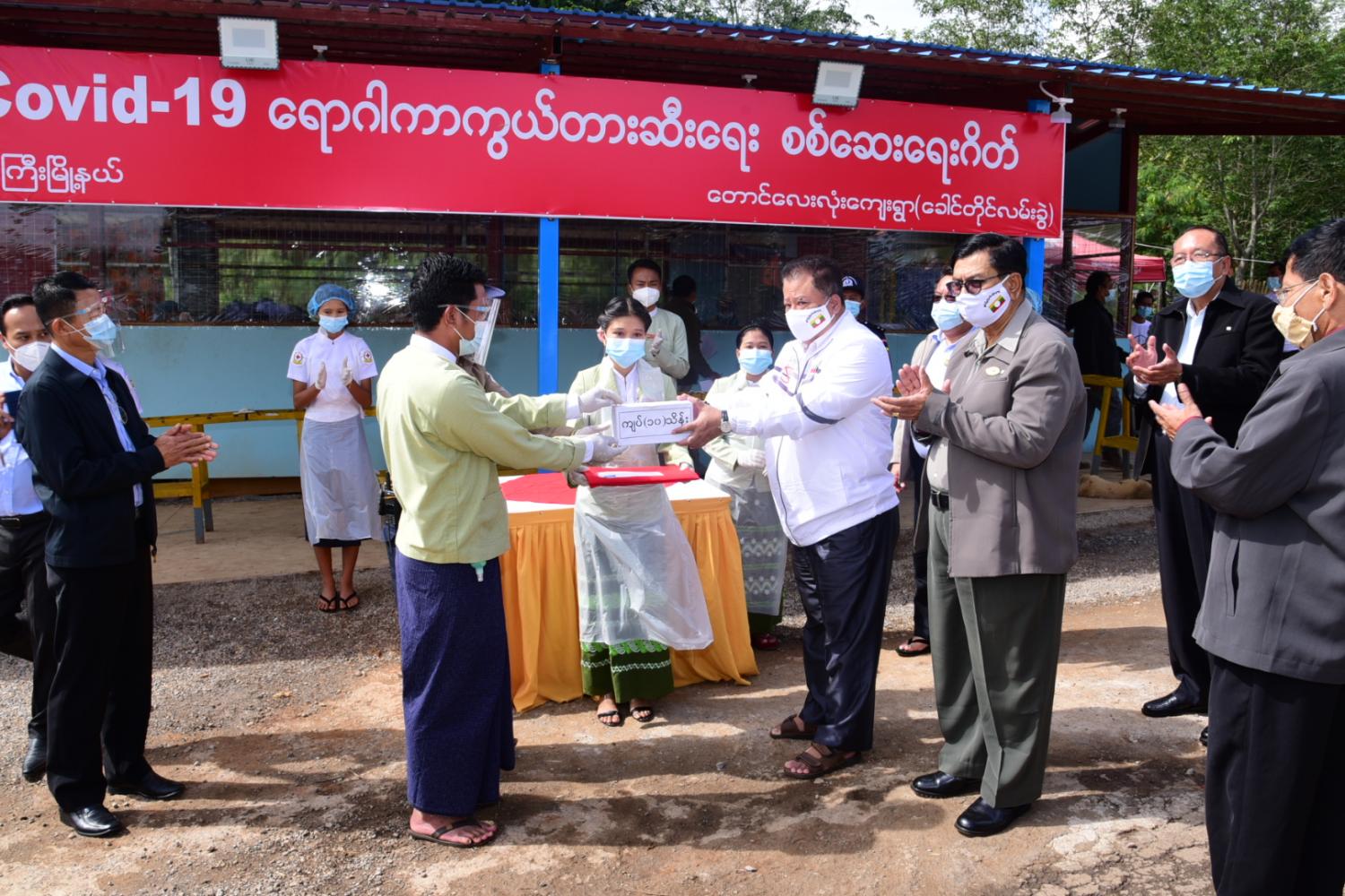 ရှမ်းပြည်နယ်အစိုးရအဖွဲ့ ပြည်နယ်ဝန်ကြီးချုပ် ဒေါက်တာလင်းထွဋ်၊ ပြည်နယ်ဥပဒေချုပ်၊ ပြည်နယ်ဝန်ကြီးများ၊ ဗမာတိုင်းရင်းသားလူမျိုးရေးရာဝန်ကြီး၊ ပြည်နယ်အစိုးရအဖွဲ့ အတွင်းရေးမှူး နှင့် တာဝန်ရှိသူများသည် ယနေ့ နံနက်(၉)နာရီခွဲအချိန်က တောင်ကြီးမြို့နယ် တောင်လေးလုံး၊ ခေါင်တိုင်လမ်းခွဲတွင် ဖွင့်လှစ်ထားသော ကိုဗစ်-၁၉ ရောဂါ ကာကွယ်ရေးကျန်းမာရေးစစ်ဆေးဂိတ်တွင် တာဝန်ကျထမ်းဆောင်နေသော ဌာနဆိုင်ရာများ၊ ကြက်ခြေနီတပ်ဖွဲ့များ၊ ပရဟိတအဖွဲ့များ၊ Volunteer အဖွဲ့များအား ထောက်ပံ့ငွေကျပ်(၁၀)သိန်း ပေးအပ်ရာ တောင်ကြီးမြို့နယ် ကိုဗစ်-၁၉ ရောဂါ ကာကွယ်ထိန်းချုပ်ကုသရေးကော်မတီဥက္ကဋ္ဌ တောင်ကြီးမြို့နယ် အုပ်ချုပ်ရေးမှူး ဦးဖြိုးမင်းထိုက်မှ လက်ခံရယူခဲ့ကြောင်း သိရသည်။