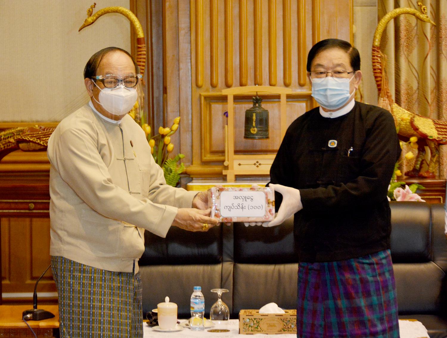 ရှေးဦးစွာ ပြည်သူ့လွှတ်တော်ဥက္ကဋ္ဌ ဦးတီခွန်မြတ် က Coronavirus Disease 2019 (COVID-19) ကာကွယ်၊ ထိန်းချုပ်၊ ကုသရေးလုပ်ငန်းများကို ရှေ့တန်းမှကိုယ်ကျိုးမငဲ့ စွမ်းစွမ်း တမံတာဝန်ထမ်းဆောင်နေသော ကျန်းမာရေးနှင့်အားကစားဝန်ကြီးဌာနမှ အရာထမ်း၊ အမှုထမ်းများနှင့် ပရဟိတစေတနာ့ ဝန်ထမ်းများအားလုံးကို လေးစားဂုဏ်ပြုသည့်အနေဖြင့် မိမိနှင့် အတူ ပြည်ထောင်စုလွှတ်တော်ရုံးနှင့် ပြည်သူ့လွှတ်တော်ရုံးမှ အရာထမ်း၊ အမှုထမ်းများ၏ စုပေါင်းလှူဒါန်းငွေကို အပ်နှံလှူဒါန်းခြင်းဖြစ်ပါကြောင်း၊ မိမိတို့ ပါဝင်လှူ ဒါန်းငွေသည် ပမာဏအားဖြင့် နည်းသော်လည်း ကိုဗစ်-၁၉ ကူးစက်ရောဂါ ကာကွယ် ထိန်းချုပ်ကုသရေး ဆိုင်ရာ စိန်ခေါ်မှုကြီးကို ရှေ့တန်းမှ တုံ့ပြန်ရင်ဆိုင်ဖြေရှင်းနေသော ကျန်းမာရေးနှင့် အားကစားဝန်ကြီးဌာနနှင့်အတူ မိမိတို့လွှတ်တော်များမှ အရာထမ်း၊ အမှုထမ်းများအားလုံးက တစ်စိတ်တည်း၊ တစ်ဝမ်းတည်း၊ တစ်သားတည်း ရပ်တည်လျက် ရှိပါကြောင်း၊ ကိုဗစ်-၁၉ ရောဂါ ဖြစ်ပွားလျက်ရှိသော်လည်း မေလ၊ ဇူလိုင်လနှင့် ဩဂုတ်လ များ၌ကျင်းပခဲ့သည့် လွှတ်တော်အစည်းအဝေးများတွင် ကျန်းမာရေးနှင့်အားကစားဝန်ကြီး ဌာနသည် အစည်း အဝေးစတင်ချိန်မှ ပြီးဆုံးသည်အထိ ကျန်းမာရေးစောင့်ရှောက်မှုများကို စနစ်တကျ ဆောင်ရွက်ပေးခဲ့သည့်အတွက် အစည်းအဝေးများကို အောင်မြင်စွာ ကျင်းပ နိုင်ခဲ့ခြင်းဖြစ်၍ လွှတ်တော်များကိုယ်စား အထူးကျေးဇူးတင်ရှိပါကြောင်း ပြောကြားကာ စုပေါင်းလှူဒါန်းငွေ ကျပ်သိန်း ၁၀၀ ကို ပြည်သူ့လွှတ်တော်ဥက္ကဋ္ဌ ဦးတီခွန်မြတ်က ကျန်းမာရေးနှင့်အားကစား ဝန်ကြီးဌာန၊ ပြည်ထောင်စုဝန်ကြီး ဒေါက်တာမြင့်ထွေး ထံသို့ ပေးအပ်လှူဒါန်းသည်။