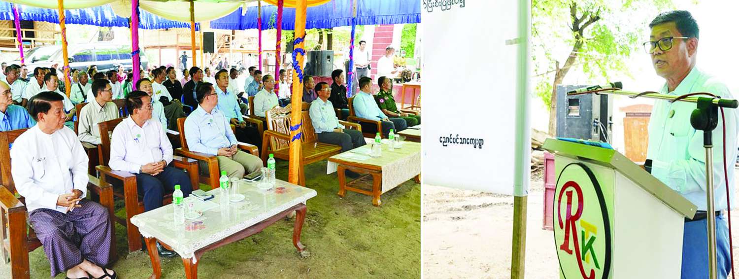 ဦးစွာ ပြည်ထောင်စုဝန်ကြီးက ၂၀၂၄ ခုနှစ်က ဖြစ်ပွားခဲ့သည့် ရေကြီးရေလျှံမှုကြောင့် ညောင်ပင်သာကျေးရွာမှ နေအိမ်များ ပျက်စီးဆုံးရှုံးခဲ့ရပါကြောင်း၊ ကျေးရွာပြန်လည်ထူထောင်ရေးနှင့် တည်ဆောက်ရေးလုပ်ငန်းများအတွက် မြန်မာနိုင်ငံခရီးသွားလုပ်ငန်းအဖွဲ့ချုပ်နှင့် ညီနောင်အသင်းများ၏ ပံ့ပိုးကူညီမှုများဖြင့် ဆောင်ရွက်ခဲ့ကြရာ ရာနှုန်းပြည့်ပြီးစီးပြီဖြစ်သည့်အတွက် အိမ်ရာများကို ကျေးရွာနေပြည်သူများထံသို့ လွှဲပြောင်းပေးခြင်းဖြစ်ပါကြောင်း၊ ကျေးရွာ၌ နေအိမ် ၂၂ လုံးအပြင် ဒေသခံများ၏ အကျိုးကိုဖော်ဆောင်နိုင်ရန် Community Center ကိုပါ ထည့်သွင်းတည်ဆောက်ပေးထားပြီး အလုပ်အကိုင်အခွင့်အလမ်းများ ဖန်တီးပေးနိုင်ရေးအတွက် လက်မှုပစ္စည်းထုတ်လုပ်ခြင်း သင်တန်းများကိုလည်း ဆောင်ရွက်ပေးသွားရန် လျာထားပါကြောင်း၊ မြန်မာနိုင်ငံ ခရီးသွားလုပ်ငန်းအဖွဲ့ချုပ်နှင့် ညီနောင်အသင်းများအနေဖြင့် ညောင်ပင်သာကျေးရွာအား ရပ်ရွာလူထု အခြေပြုခရီးသွားလုပ်ငန်း စံပြကျေးရွာတစ်ခုအဖြစ် ဖော်ဆောင်သွားနိုင်ရေးအတွက် ဆက်လက်ကူညီပံ့ပိုးပေးသွားစေလိုပါကြောင်း၊ ညောင်ပင်သာ ကျေးရွာပြန်လည်ထူထောင်ရေးလုပ်ငန်းများ ဆောင်ရွက်နိုင်ရေးအတွက် ကူညီပံ့ပိုးပေးကြသူများအားလုံးကို ကျေးဇူးတင်ရှိပါကြောင်း ပြောကြားသည်။