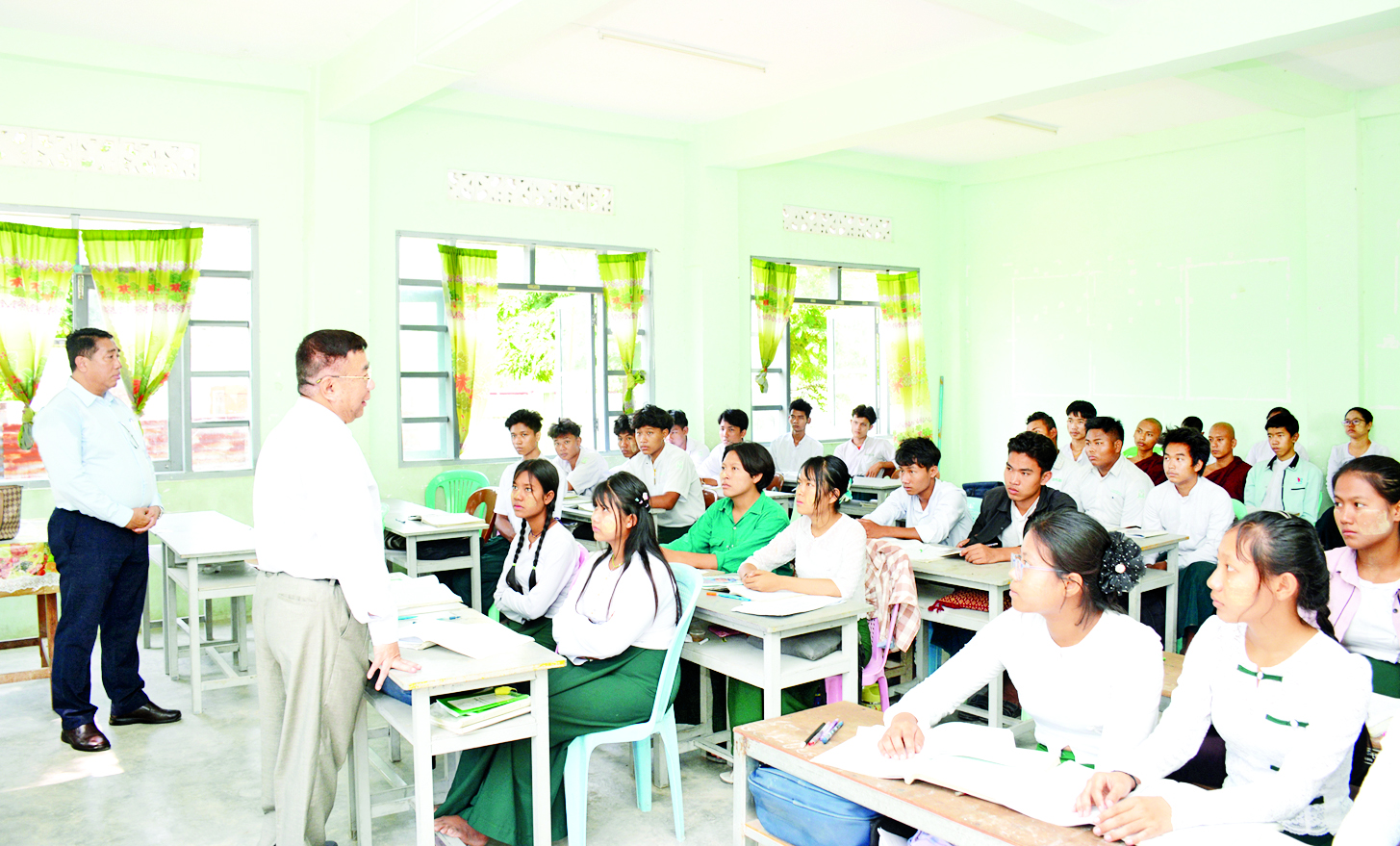 ယင်းနောက် ပြည်ထောင်စုဝန်ကြီးသည် တက္ကသိုလ်ပါမောက္ခ၊ ဆရာ ဆရာမများနှင့် အခြေခံပညာ ဆရာ ဆရာမများက ၂၀၂၅ ခုနှစ် တက္ကသိုလ်ဝင် စာမေးပွဲပြန်လည်ဖြေဆိုကြမည့် ကျောင်းသား ကျောင်းသူများအား ဘာသာရပ်အလိုက် သင်ကြားပို့ချပေးနေမှုများကို လိုက်လံကြည့်ရှုအားပေးကာ တိုင်းဒေသကြီးနှင့် ပြည်နယ်လေးခုမှ အစိုးအဖွဲ့များနှင့် သက်ဆိုင်ရာအဖွဲ့အစည်းများကလည်း တက္ကသိုလ်နှင့် အခြေခံပညာအထက်တန်းကျောင်းများတွင် စခန်းသွင်းလေ့ကျင့်ရေး Camp များတွင် စားသောက်ရေး၊ နေထိုင်ရေးစသည်ဖြင့် အခက်အခဲမရှိ အဆင်ပြေအောင် ဝိုင်းဝန်းဖြည့်ဆည်းဆောင်ရွက်ပေးလျက်ရှိပါကြောင်း၊ တက္ကသိုလ်ဝင်စာမေးပွဲ ပြန်လည်ဖြေဆိုကြမည့် ကျောင်းသား ကျောင်းသူများအနေဖြင့် ဆရာ ဆရာမများ၏ သင်ကြားပို့ချမှုများကို ဇွဲ၊ လုံ့လ၊ ဝီရိယထား၍ ကြိုးစားသင်ယူကြစေလိုပါကြောင်း အားပေးစကားပြောကြားကာ လိုအပ်သည်များကို ဖြည့်ဆည်းဆောင်ရွက်ပေးခဲ့ကြောင်း သိရသည်။