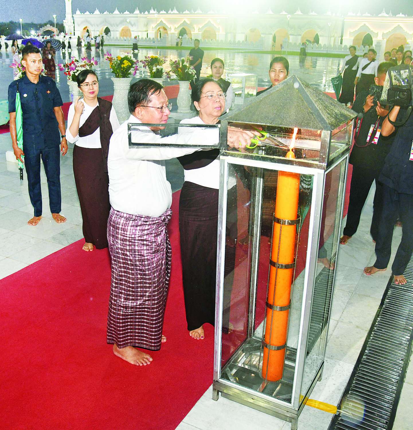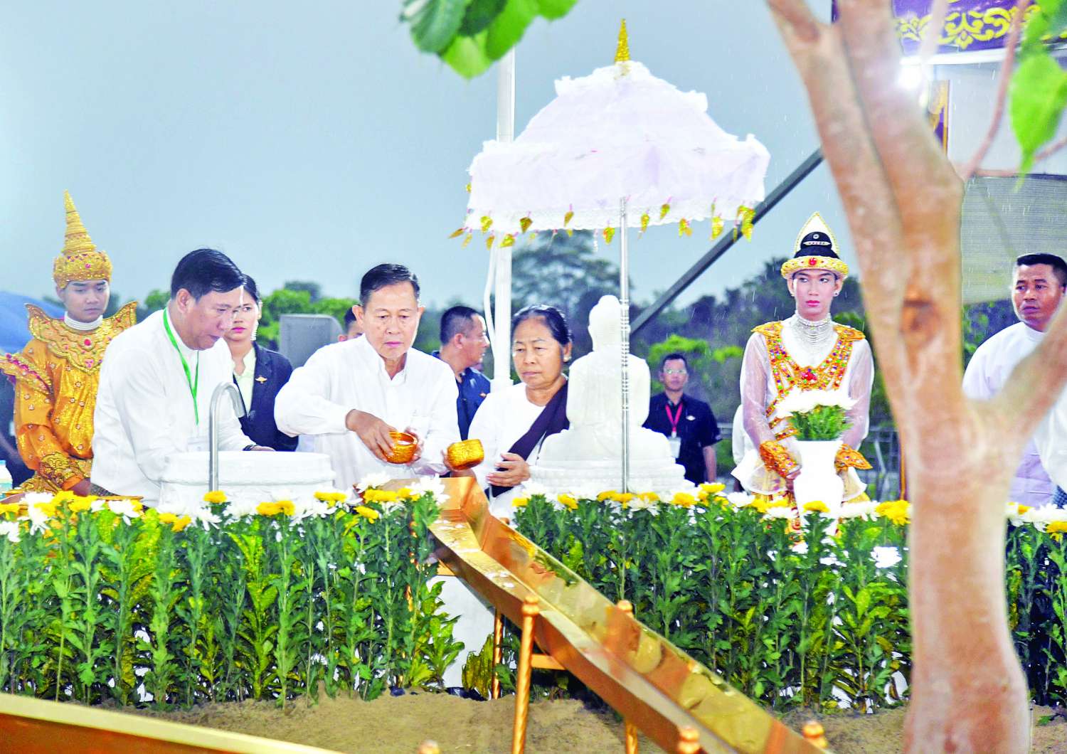 နိုင်ငံတော်စီမံအုပ်ချုပ်ရေးကောင်စီဥက္ကဋ္ဌ နိုင်ငံတော်ဝန်ကြီးချုပ် ဗိုလ်ချုပ်မှူးကြီး မင်းအောင်လှိုင်နှင့်ဇနီး ဒေါ်ကြူကြူလှ ကဆုန်ညောင်ရေသွန်းလောင်းပူဇော်