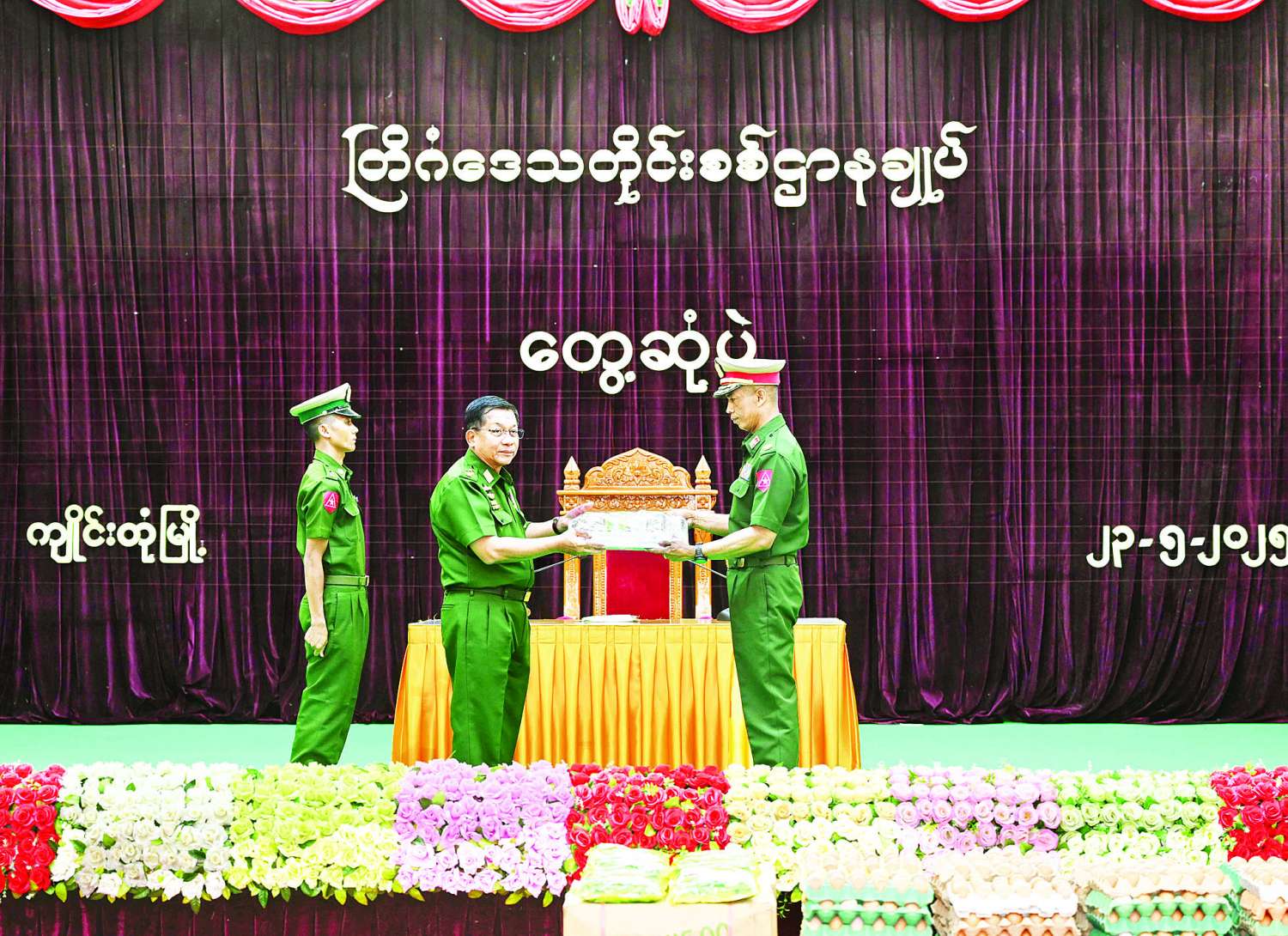 ထို့နောက် နိုင်ငံတော်စီမံအုပ်ချုပ်ရေးကောင်စီဥက္ကဋ္ဌ တပ်မတော်ကာကွယ်ရေးဦးစီးချုပ်က ကျိုင်းတုံတပ်နယ်မှ အရာရှိ၊ စစ်သည်၊ မိသားစုများအတွက် စားသောက်ဖွယ်ရာပစ္စည်းများကို ပေးအပ်ရာ တိုင်းမှူးကလည်းကောင်း၊ နိုင်ငံတော်စီမံအုပ်ချုပ်ရေးကောင်စီဥက္ကဋ္ဌ တပ်မတော်ကာကွယ်ရေးဦးစီးချုပ်၏ဇနီးက တပ်နယ်မိခင်နှင့် ကလေးစောင့်ရှောက်ရေးအသင်းအတွက် ချီးမြှင့်ငွေများကို ပေးအပ်ရာတိုင်းမှူး၏ ဇနီးကလည်းကောင်း အသီးသီးလက်ခံရယူကြသည်။