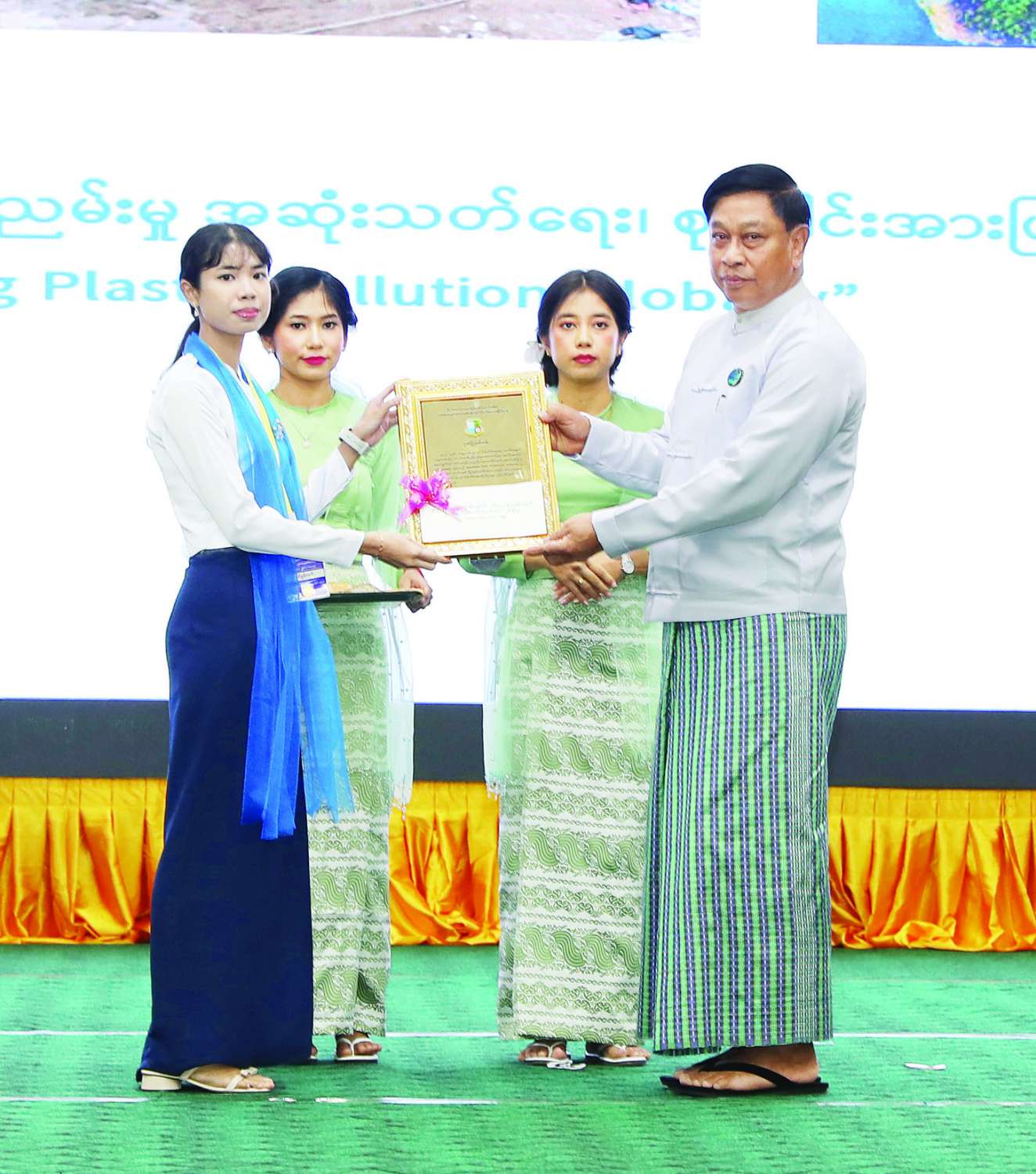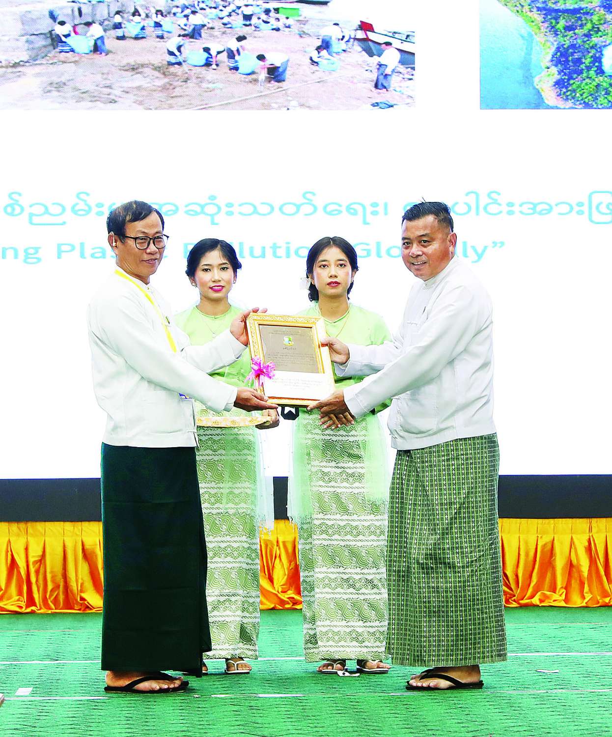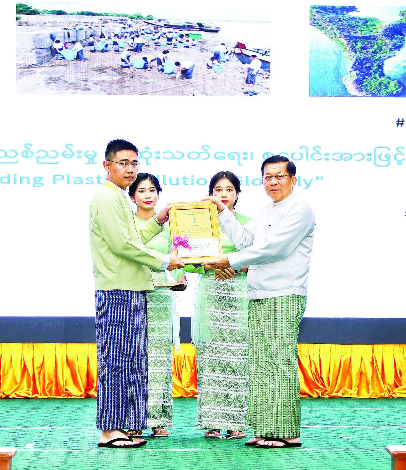 ထို့နောက် နိုင်ငံတော်စီမံအုပ်ချုပ်ရေးကောင်စီဥက္ကဋ္ဌ နိုင်ငံတော်ဝန်ကြီးချုပ်က ပတ်ဝန်းကျင် စီမံခန့်ခွဲမှုကောင်းမွန်သောမြို့ ဆုရရှိသည့် ရှမ်းပြည်နယ်(အရှေ့ပိုင်း)၊ ကျိုင်းတုံမြို့မှ တာဝန်ရှိသူထံလည်းကောင်း၊ ပတ်ဝန်းကျင်စီမံခန့်ခွဲမှုကောင်းမွန်သော ကျေးရွာဆုရရှိသည့် မန္တလေးတိုင်းဒေသကြီး၊ ညောင်ဦးမြို့နယ်၊ မြင်းကပါကျေးရွာမှ တာဝန်ရှိသူထံလည်းကောင်း၊ ပတ်ဝန်းကျင်စီမံခန့်ခွဲမှု ကောင်းမွန်သော စက်ရုံဆုရရှိသည့် မန္တလေးတိုင်းဒေသကြီး၊ သာစည်မြို့နယ်ရှိ Great Success Energy Co.Ltd (၃၀ မဂ္ဂဝပ် နေရောင်ခြည်စွမ်းအင်သုံး လျှပ်စစ်ဓာတ်အား ထုတ်လုပ်ခြင်းလုပ်ငန်း)မှ တာဝန်ရှိသူထံလည်းကောင်း ဆုများပေးအပ်ချီးမြှင့်သည်။