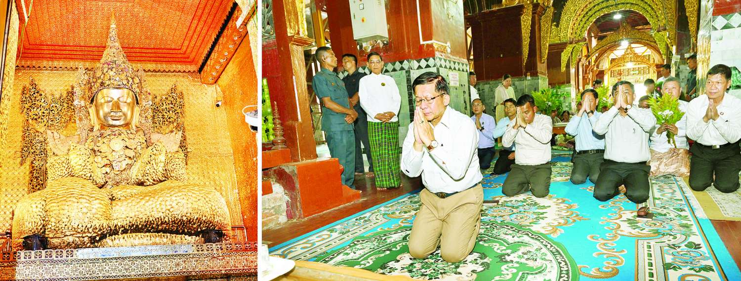 ၎င်းနောက် နိုင်ငံတော်စီမံအုပ်ချုပ်ရေးကောင်စီဥက္ကဋ္ဌ နိုင်ငံတော်ဝန်ကြီးချုပ်နှင့် အဖွဲ့ဝင်များသည် မဟာမြတ်မုနိဘုရားကြီးသို့ရောက်ရှိကြပြီး ပန်း၊ ရေချမ်းကပ်လှူပူဇော်ကာ ဖူးမြော်ကြည်ညိုသည်။ ထို့နောက် ငလျင်ဘေးဒဏ်ဖြစ်ပေါ်ချိန်တွင် ပြင်းထန်သောလှုပ်ခတ်မှုများကြောင့် မြေခခဲ့ရသည့် စိန်ဖူးတော်၊ ငှက်မြတ်နားတော်တို့၌ စေတနာရှင် အများပြည်သူများလှူဒါန်းထားရှိသည့် ရတနာရွှေငွေကျောက်သံပတ္တမြားနှင့် စိန်ဖူးတော်များ၊ ငလျင်လှုပ်ခတ်စဉ် ကွာကျခဲ့ရသည့် ရှေးဟောင်းလက်ရာ နံရံဆေးရေးပန်းချီများ ကြည့်ရှုစစ်ဆေးပြီး တာဝန်ရှိသူများကို လိုအပ်သည်များ လမ်းညွှန်မှာကြားသည်။