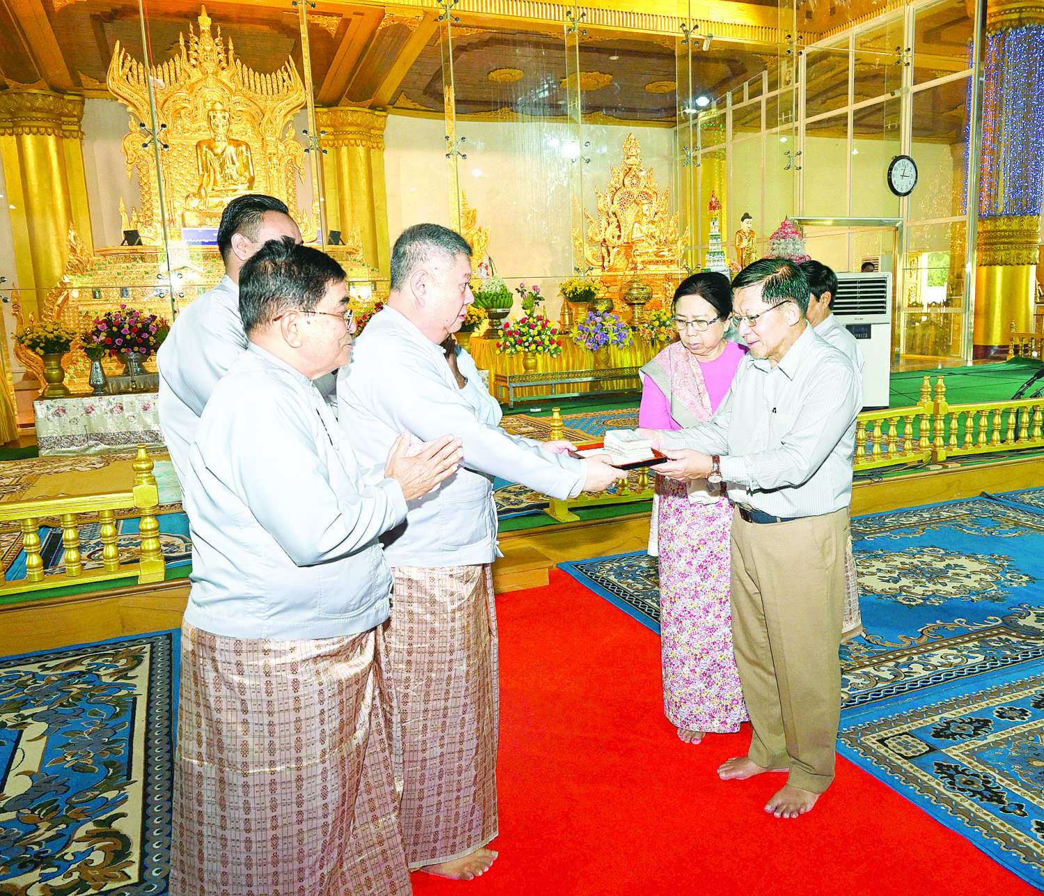 ယင်းနောက် နိုင်ငံတော်စီမံအုပ်ချုပ်ရေးကောင်စီဥက္ကဋ္ဌ နိုင်ငံတော်ဝန်ကြီးချုပ်နှင့် ဇနီးတို့က စေတီတော်မြတ်ကြီးအတွက် ဘက်စုံစုပေါင်းအလှူတော်ငွေများကို ပေးအပ်လှူဒါန်းရာ ဂေါပကအဖွဲ့ဝင်များက လက်ခံရယူကြသည်။