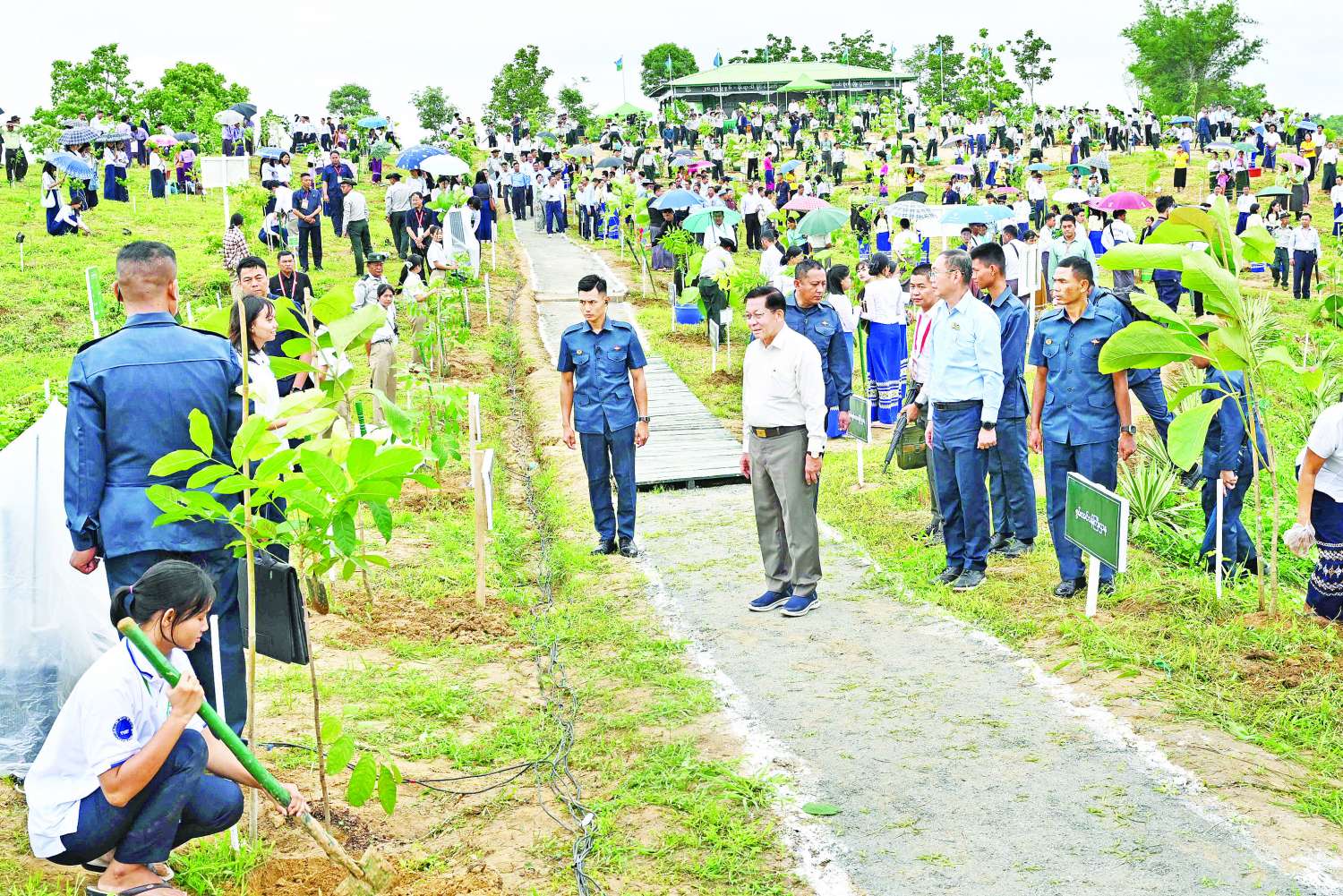 နိုင်ငံတော်အနေဖြင့် ၂၀၂၁ ခုနှစ် မိုးရာသီမှ ၂၀၂၄ ခုနှစ် မိုးရာသီအထိ နိုင်ငံအဝန်းတွင် ပျိုးပင်စုစုပေါင်း ၉၀ ဒသမ ၅၅ သန်းကျော် ဖြန့်ဝေစိုက်ပျိုးပေးနိုင်ခဲ့ကြောင်း၊ နေပြည်တော်တွင် မိမိကိုယ်တိုင်ဦးဆောင်မှုနှင့် သစ်ပင်စိုက်ပျိုးပွဲ(၉)ကြိမ် ပြုလုပ်ခဲ့ပြီး (၃,၂၀၉,၇၀၃)ပင် စိုက်ပျိုးနိုင်ခဲ့ကြောင်း၊ ရှင်သန်ဖြစ်ထွန်းမှု (၃,၀၃၂,၉၈၂)ပင် (၉၄ ရာခိုင်နှုန်း)ရှိကြောင်း၊ ဖြန့်ဝေစိုက်ပျိုးခဲ့သည့် သစ်ပင်များသည် သစ်တောနယ်မြေများဖြစ်သည့် ကြိုးဝိုင်း၊ ကြိုးပြင်ကာကွယ်တောများအတွင်း၌ စိုက်ပျိုးခြင်းသာမကပဲ သစ်တောနယ်မြေ ပြင်ပနေရာများ၌လည်း ဌာနဆိုင်ရာများနှင့် ဒေသခံပြည်သူများက မိုးရာသီ လူထုလှုပ်ရှားမှုအသွင်ဖြင့် စိုက်ပျိုးခဲ့ခြင်းဖြစ်ကြောင်း၊ ထို့ကြောင့် စိုက်ပျိုးလိုက်သည့်သစ်ပင်များ ရာနှုန်းပြည့်အောင်မြင်ရှင်သန်ရေးအတွက် ပြုစုထိန်းသိမ်းရေးလုပ်ငန်းများကိုလည်း အားလုံးဝိုင်းဝန်းဆောင်ရွက်ပေးကြရန် မှာကြားလိုကြောင်း၊ ယခုနှစ်မိုးရာသီ၌လည်း အမြင့် ၂ ပေအထက် ပျိုးပင် ၂၀ ဒသမ ၅၉ သန်းကို နိုင်ငံအဝန်းဖြန့်ဝေပေးထားပြီး စိုက်ပျိုးသွားမည်ဖြစ်ကြောင်း။