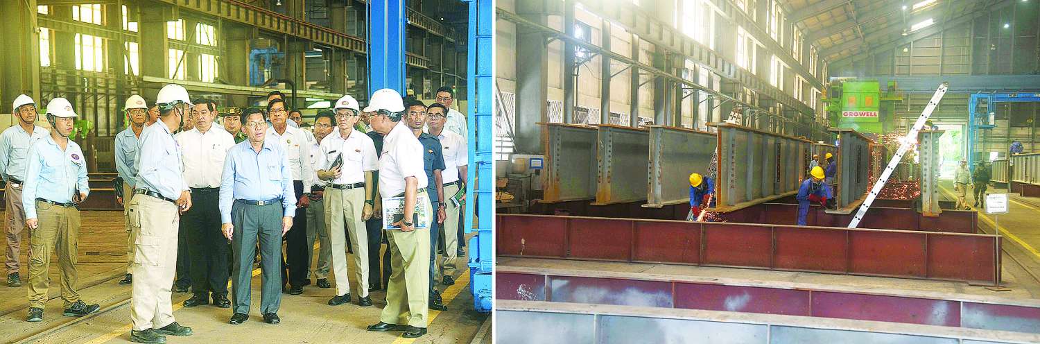 ဆက်လက်၍ စက်ရုံမှ ထွက်ရှိသည့် သံမဏိများနှင့် ပြည်ပနိုင်ငံများမှ ထုတ်လုပ်ထားသည့် သံမဏိများအား အရည်အသွေး နှိုင်းယှဉ်ပြသထားရှိမှုအား ကြည့်ရှုစစ်ဆေးပြီး စက်ရုံအတွင်း လှည့်လည်၍ HRB-500 Steel Billet များ ထုတ်လုပ်နေမှုလုပ်ငန်းစဉ်အဆင့်ဆင့်အား ကြည့်ရှုစစ်ဆေးပြီး တာဝန်ရှိသူများ၏ တင်ပြချက်များအပေါ် လိုအပ်သည်များ လမ်းညွှန်မှာကြားသည်။