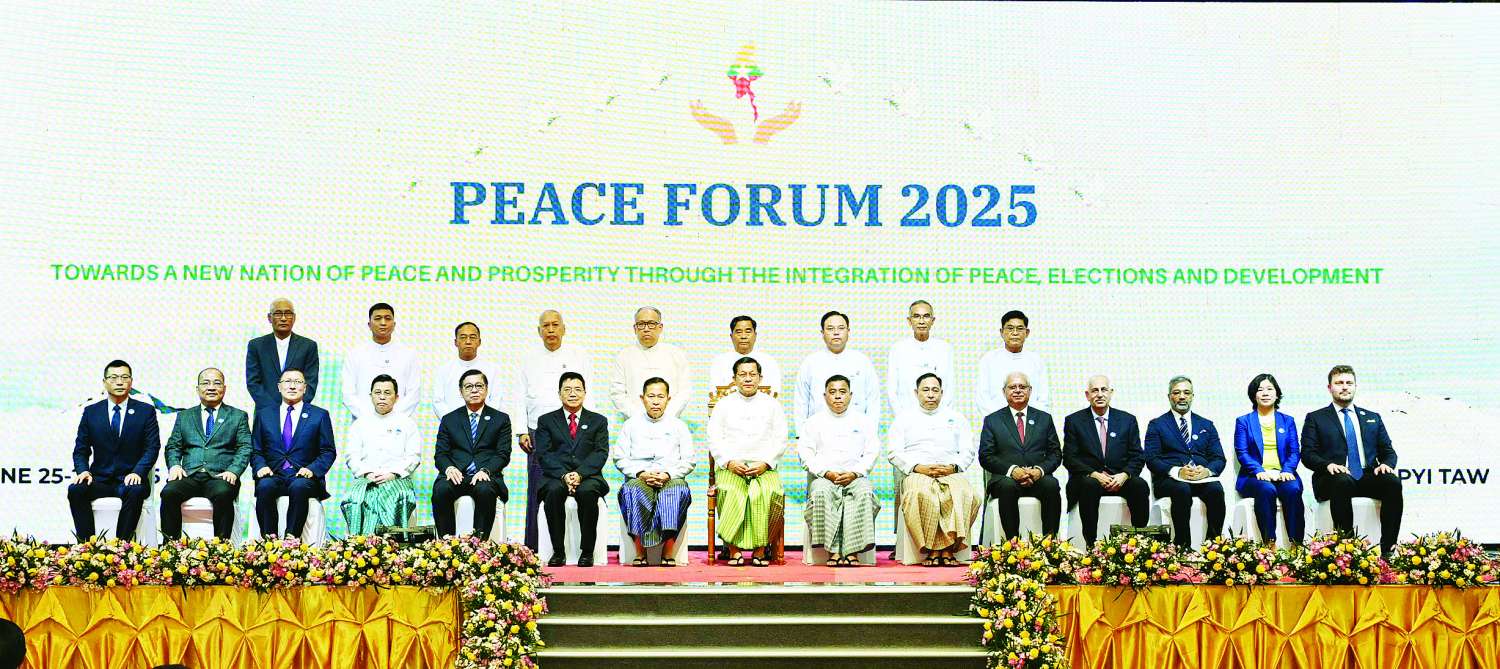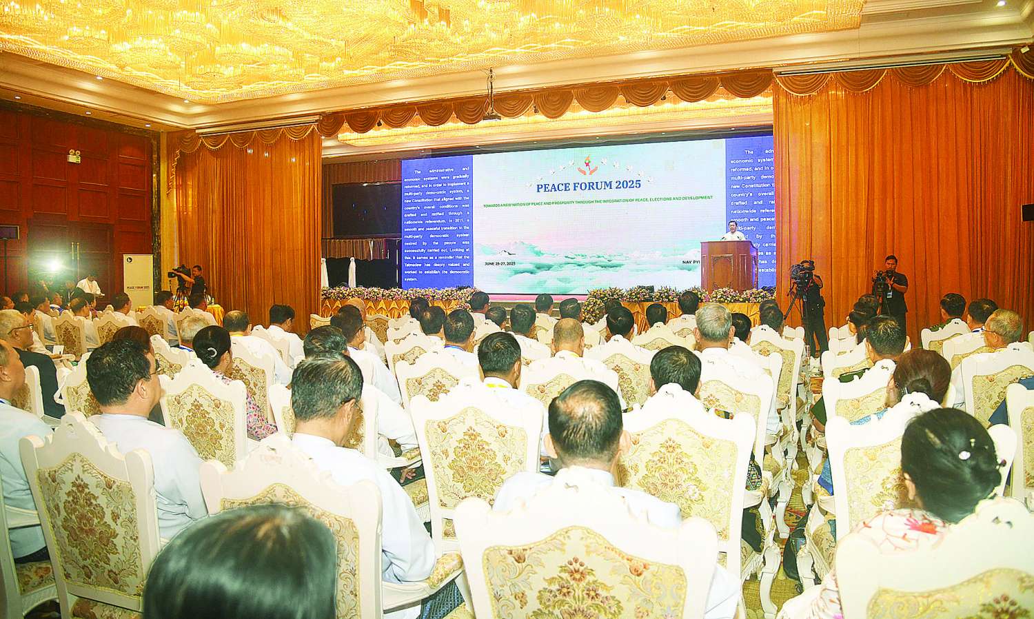 နိုင်ငံတော်စီမံအုပ်ချုပ်ရေးကောင်စီဥက္ကဋ္ဌ နိုင်ငံတော်ဝန်ကြီးချုပ် အမျိုးသားစည်းလုံးညီညွတ်ရေးနှင့် ငြိမ်းချမ်းရေးဖော်ဆောင်မှုဗဟိုကော်မတီဥက္ကဋ္ဌ ဗိုလ်ချုပ်မှူးကြီးမင်းအောင်လှိုင် ငြိမ်းချမ်းရေးဖိုရမ်-Peace Forum 2025 “ငြိမ်းချမ်းရေး၊ ရွေးကောက်ပွဲနှင့် ဖက်ဒရယ်စနစ်တို့ပေါင်းစည်းခြင်းမှ အေးချမ်းသာယာဝပြောသည့် နိုင်ငံတော်သစ်ဆီသို့” သုံးသပ်ဆွေးနွေးပွဲဖွင့်ပွဲသို့ တက်ရောက်အမှာစကားပြောကြား