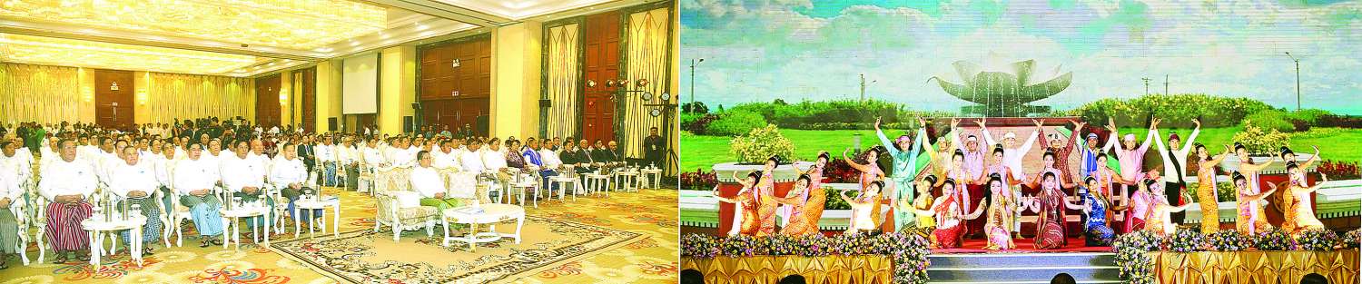 ဦးစွာအခမ်းအနားကို စတင်ကျင်းပပြုလုပ်ရာ နိုင်ငံတော်စီမံအုပ်ချုပ်ရေးကောင်စီဥက္ကဋ္ဌ နိုင်ငံတော်ဝန်ကြီးချုပ် အမျိုးသားစည်းလုံးညီညွတ်ရေးနှင့် ငြိမ်းချမ်းရေးဖော်ဆောင်မှုဗဟိုကော်မတီဥက္ကဋ္ဌနှင့် အခမ်းအနားတက်ရောက်လာကြသူများသည် သာသနာရေးနှင့်ယဉ်ကျေးမှုဝန်ကြီးဌာန၊ အနုပညာဦးစီးဌာနမှ အနုပညာရှင်များက “စိမ်းလန်းအတွေးရည် ငြိမ်းချမ်းတေးပန်းချီ” တိုင်းရင်းသားပေါင်းစုံတေးသရုပ်ဖော်အကဖြင့် ဖျော်ဖြေတင်ဆက်မှုကိုကြည့်ရှုအားပေးကြသည်။