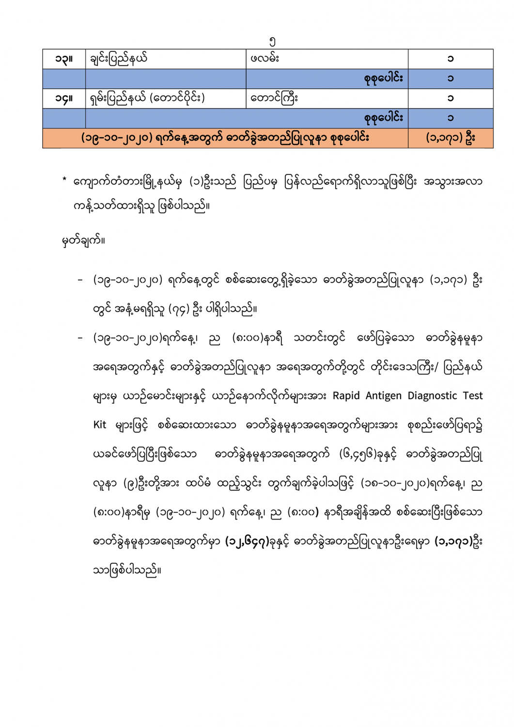COVID-19 ရောဂါစောင့်ကြပ်ကြည့်ရှုမှုနှင့်ပတ်သက်၍ သတင်းထုတ်ပြန်ခြင်း (၂၀-၁၀-၂၀၂၀) ရက်နေ့၊ ညနေ (၆:၀၀)နာရီ