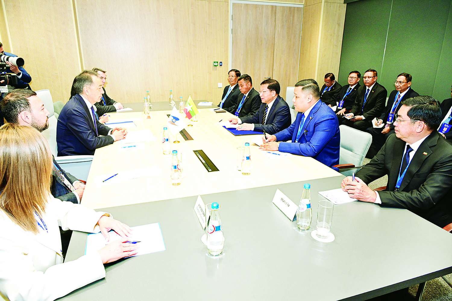ဆက်လက်ပြီး နိုင်ငံတော်စီမံအုပ်ချုပ်ရေးကောင်စီဥက္ကဋ္ဌ နိုင်ငံတော်ဝန်ကြီးချုပ်နှင့် ဥရောပ-အာရှ စီးပွားရေးကော်မရှင် ဘုတ်အဖွဲ့ဥက္ကဋ္ဌတို့သည် မြန်မာနိုင်ငံနှင့် (EAEU) အဖွဲ့ဝင်နိုင်ငံများအကြား စီးပွားရေးဆိုင်ရာပူးပေါင်းဆောင်ရွက်မှုများကို မြှင့်တင်ဆောင်ရွက်သွားနိုင်မည့်ကိစ္စရပ်များ၊ မြန်မာနိုင်ငံ၏ စိုက်ပျိုးရေးကဏ္ဍမြှင့်တင်ရေး၊ သယ်ယူပို့ဆောင်ရေးကဏ္ဍမြှင့်တင်ရေး၊ သတ္တုတူးဖော်မှုဆိုင်ရာ နည်းပညာမြှင့်တင်ရေးနှင့် စွမ်းအင်ကဏ္ဍမြှင့်တင်ရေးတို့တွင် နည်းပညာပိုင်းဆိုင်ရာ၊ ပူးပေါင်းဆောင်ရွက်မှုဆိုင်ရာ လုပ်ဆောင်သွားနိုင်မည့် ကိစ္စရပ်များ၊ မြန်မာနိုင်ငံနှင့် (EAEU) အဖွဲ့ဝင်နိုင်ငံများအကြား တိုက်ရိုက်ကုန်သွယ်မှုနှင့် ရင်းနှီးမြှုပ်နှံမှုများ ပြုလုပ်ခြင်း၊ ကုန်စည်ပြပွဲများ၊ ဖိုရမ်များ ကျင်းပခြင်းတို့ဖြင့် စီးပွားရေးကုန်သွယ်မှုအခွင့်အလမ်းကို ပိုမိုအရှိန်အဟုန်မြှင့်တင်ဆောင်ရွက်နိုင်မည့် ကိစ္စရပ်များ၊ မြန်မာနိုင်ငံအနေဖြင့် ဥရောပ - အာရှ စီးပွားရေးသမဂ္ဂ (EAEU) ၏ လေ့လာသူနိုင်ငံအဆင့်အထိ တက်လှမ်းနိုင်ရေးကူညီဆောင်ရွက်ပေးသွားမည်ဖြစ်ပြီး စီးပွားရေးဆိုင်ရာ ပူးပေါင်းဆောင်ရွက်မှု အလားအလာကောင်းများစွာကို ဖော်ဆောင်ပေးနိုင်မည့် ကိစ္စရပ်များနှင့် ပတ်သက်၍ ရင်းနှီးပွင့်လင်းစွာ အမြင်ချင်းဖလှယ်ဆွေးနွေးခဲ့ကြသည်။