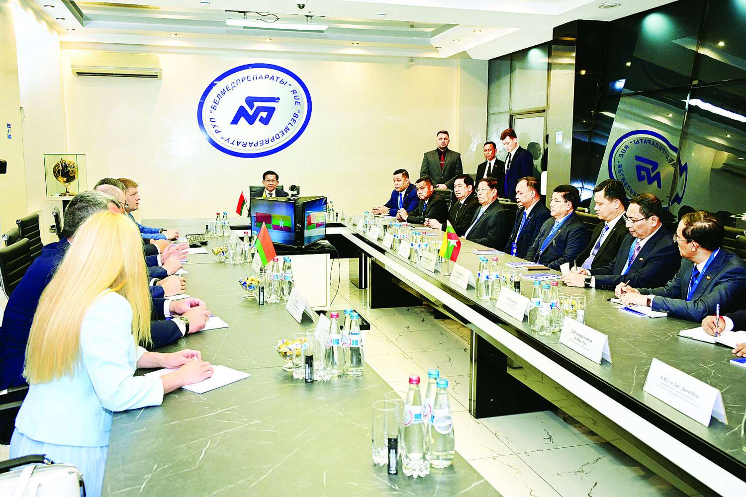 ယင်းနောက် နိုင်ငံတော်စီမံအုပ်ချုပ်ရေးကောင်စီဥက္ကဋ္ဌ နိုင်ငံတော်ဝန်ကြီးချုပ်နှင့် အဖွဲ့ဝင်များ၊ ဘယ်လာရုစ်သမ္မတနိုင်ငံ၊ ကျန်းမာရေးဝန်ကြီးဌာနဝန်ကြီးနှင့် အဖွဲ့ဝင်များသည် ဆေးဝါးစက်ရုံအစည်းအဝေးခန်းမအတွင်း တွေ့ဆုံ၍ နှစ်နိုင်ငံအကြား ကျန်းမာရေးကဏ္ဍတွင် ပူးပေါင်းဆောင်ရွက်နိုင်မည့် အခြေအနေများ၊ ဘယ်လာရုစ်နိုင်ငံမှထုတ်လုပ်သည့် ဆေးနှင့် ဆေးပစ္စည်းဆိုင်ရာများအား မြန်မာနိုင်ငံကျန်းမာရေးကဏ္ဍတွင် အသုံးပြုသွားနိုင်မည့် အခြေအနေများ၊ Belmedpreparaty ဆေးဝါးစက်ရုံမှ တာဝန်ရှိသူများနှင့် မြန်မာနိုင်ငံမှ ကျန်းမာရေးဆိုင်ရာတာဝန်ရှိသူတို့ အသေးစိတ်ဆက်လက်ဆွေးနွေးဆောင်ရွက်သွားမည့် အခြေအနေများနှင့် ပတ်သက်၍ အမြင်ချင်းဖလှယ်ဆွေးနွေးခဲ့ကြသည်။