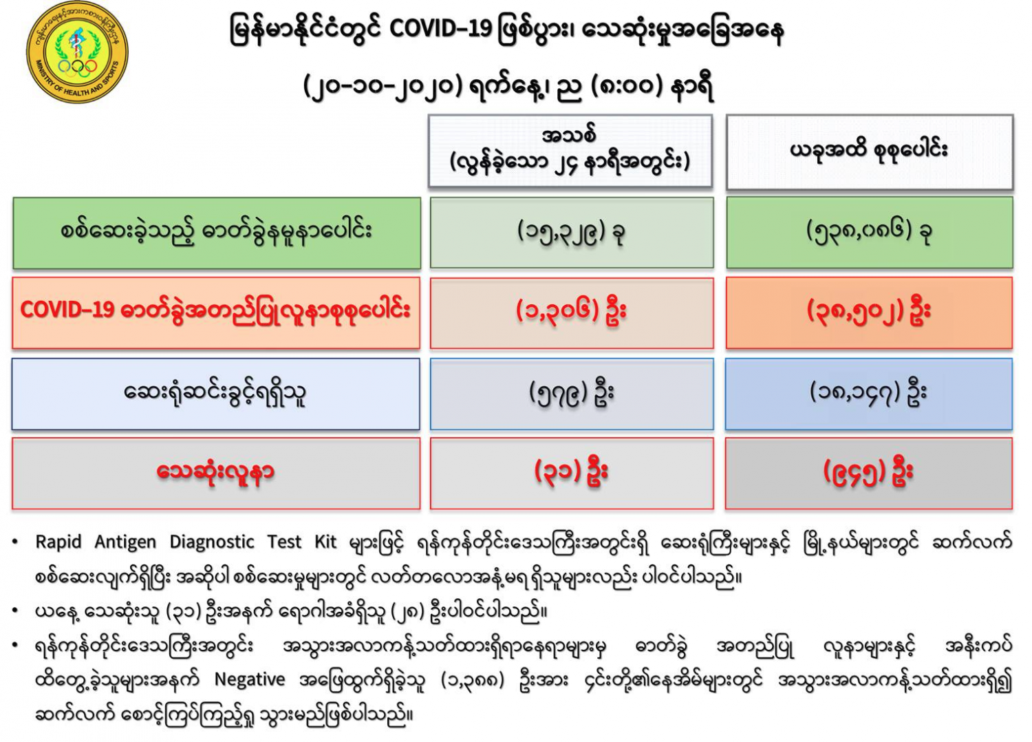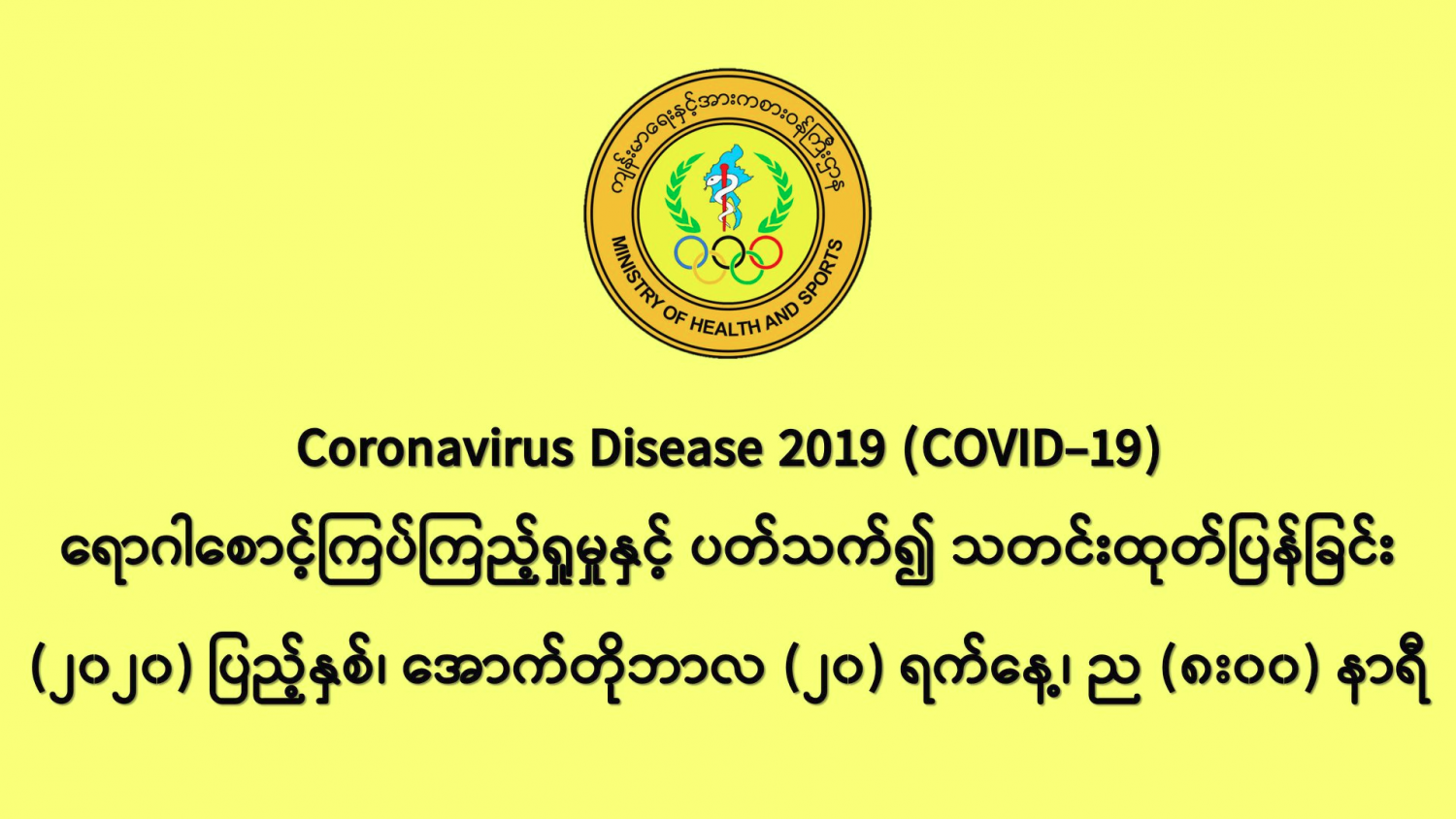 COVID-19 ရောဂါစောင့်ကြပ်ကြည့်ရှုမှုနှင့်ပတ်သက်၍ သတင်းထုတ်ပြန်ခြင်း (၂၀-၁၀-၂၀၂၀) ရက်နေ့၊ ည (၈:၀၀)နာရီ