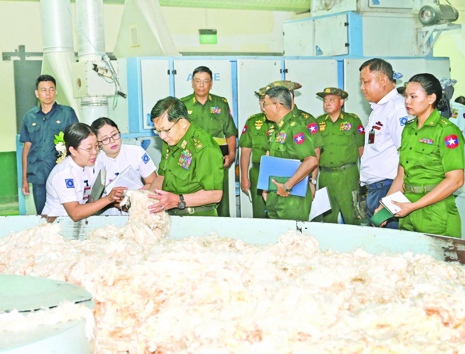 ယင်းနောက် နိုင်ငံတော်စီမံအုပ်ချုပ်ရေးကောင်စီဥက္ကဋ္ဌ တပ်မတော်ကာကွယ်ရေးဦးစီးချုပ်နှင့် အဖွဲ့ဝင်များသည် စက်ရုံအတွင်းရှိ ချည်ငင်အလုပ်ရုံ၊ ချည်ကျစ်အလုပ်ရုံများအတွင်း ချည်များအဆင့်ဆင့် ထုတ်လုပ်နေမှုအခြေအနေများကို လှည့်လည်ကြည့်ရှုစစ်ဆေးပြီး တာဝန်ရှိသူများ၏ တင်ပြချက်များအပေါ် လိုအပ်သည်များ လမ်းညွှန်မှာကြားသည်။
