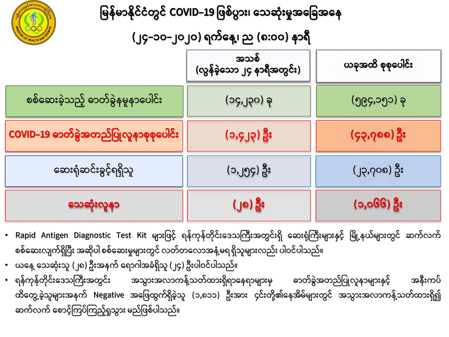 COVID-19 ရောဂါစောင့်ကြပ်ကြည့်ရှုမှုနှင့်ပတ်သက်၍ သတင်းထုတ်ပြန်ခြင်း (၂၄-၁၀-၂၀၂၀) ရက်နေ့၊ ည (၈:၀၀)နာရီ 10/24/2020 (၂၃-၁၀-၂၀၂၀) ရက်နေ့၊ ည (၈:၀၀)နာရီမှ (၂၄-၁၀-၂၀၂၀) ရက်နေ့၊ ည (၈:၀၀) နာရီ အတွင်း ဓာတ်ခွဲနမူနာ စုစုပေါင်း (၁၄,၂၃၀) ခုအား စစ်ဆေးပြီးစီးခဲ့ရာ COVID-19 ရောဂါ ဓာတ်ခွဲ အတည်ပြု လူနာသစ် (၁,၄၂၃)ဦး တွေ့ရှိရပါသည်။