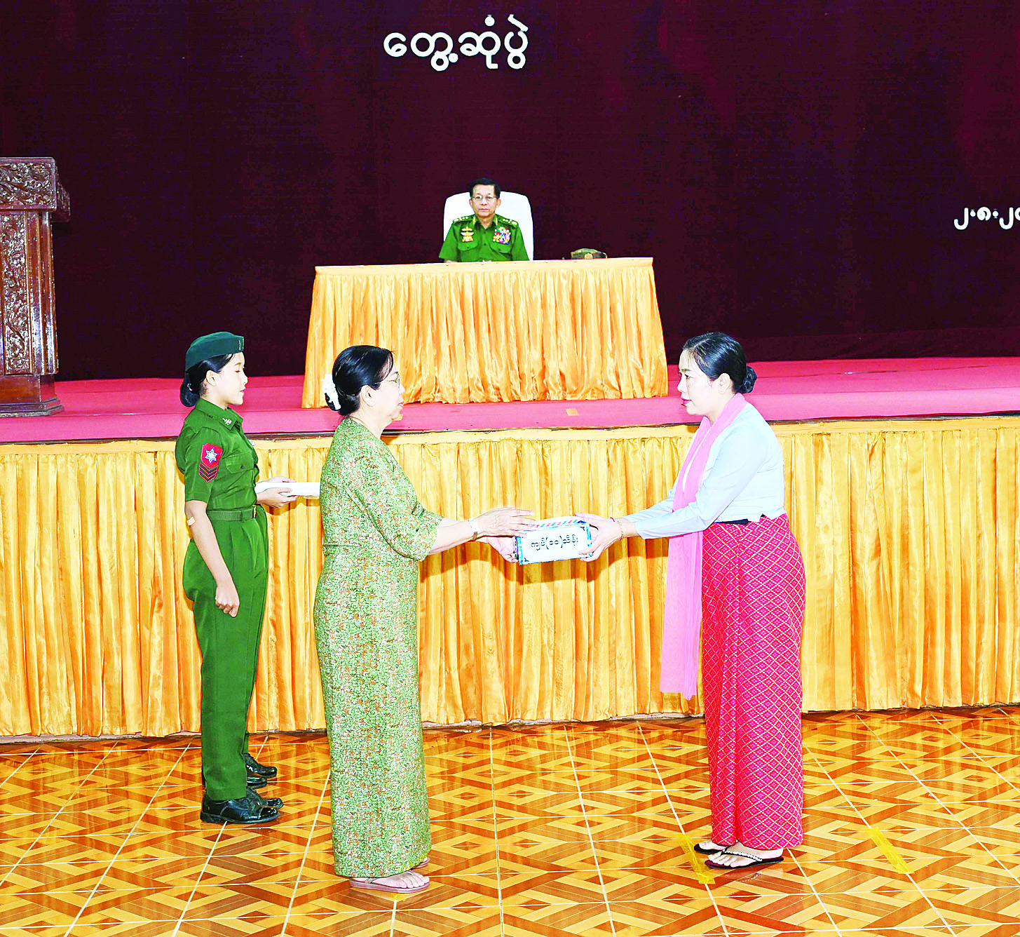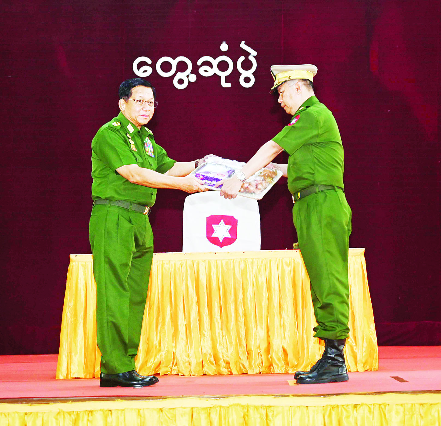 ထို့နောက် နိုင်ငံတော်လုံခြုံရေးနှင့် အေးချမ်းသာယာရေးကော်မရှင်ဥက္ကဋ္ဌ တပ်မတော်ကာကွယ်ရေးဦးစီးချုပ်က တပ်နယ်မှ အရာရှိ၊ စစ်သည်၊ မိသားစုများအတွက် စားသောက်ဖွယ်ရာပစ္စည်းများကိုပေးအပ်ရာ တိုင်းမှူးကလည်းကောင်း၊ နိုင်ငံတော်လုံခြုံရေးနှင့် အေးချမ်းသာယာရေးကော်မရှင်ဥက္ကဋ္ဌ တပ်မတော်ကာကွယ်ရေးဦးစီးချုပ်၏ဇနီးက တပ်နယ်မိခင်နှင့်ကလေးစောင့်ရှောက်ရေးအသင်းအတွက် ချီးမြှင့်ငွေများကို ပေးအပ်ရာ တိုင်းမှူး၏ဇနီးကလည်းကောင်း အသီးသီးလက်ခံရယူကြသည်။