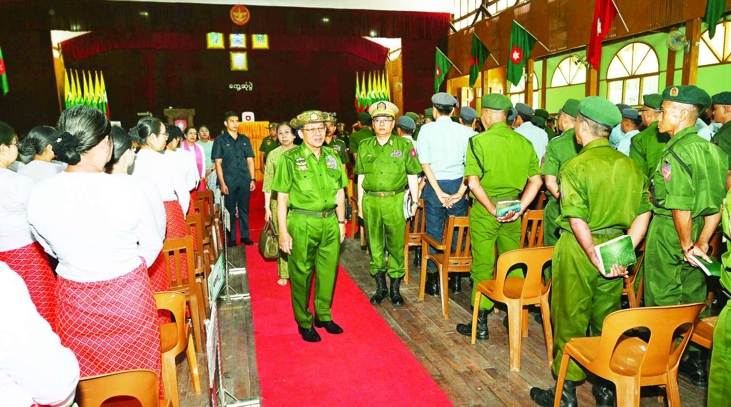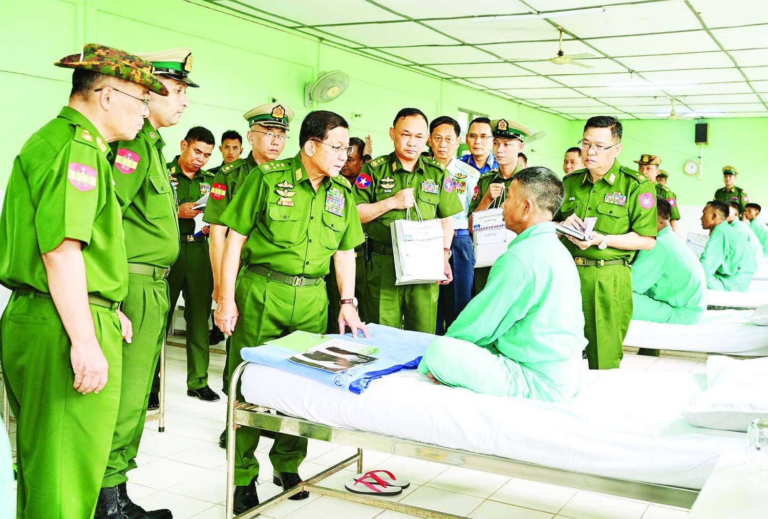 ယင်းနောက် နိုင်ငံတော်လုံခြုံရေးနှင့် အေးချမ်းသာယာရေးကော်မရှင်ဥက္ကဋ္ဌ တပ်မတော်ကာကွယ်ရေးဦးစီးချုပ်သည် တပ်နယ်ရှိ နယ်မြေခံတပ်မတော်ဆေးရုံတွင် တက်ရောက်ကုလျက်ရှိသည့် နိုင်ငံတော်ကာကွယ်ရေးနှင့် လုံခြုံရေးတာဝန်များ ထမ်းဆောင်စဉ် ထိခိုက်ဒဏ်ရာရရှိခဲ့သော အရာရှိ၊ စစ်သည်များအား ထိခိုက်ဒဏ်ရာရရှိခဲ့မှုအခြေအနေများ၊ ရောဂါကုသပျောက်ကင်းမှုအခြေအနေများကို တစ်ဦးချင်း လိုက်လံတွေ့ဆုံ၍ ရင်းနှီးနွေးထွေးစွာမေးမြန်းပြီး အားပေးစကားပြောကြားကာ အရာရှိ၊စစ်သည်များ၏ တင်ပြချက်များအပေါ် လိုအပ်သည်များ ဖြည့်ဆည်းဆောင်ရွက်ပေးသည်။