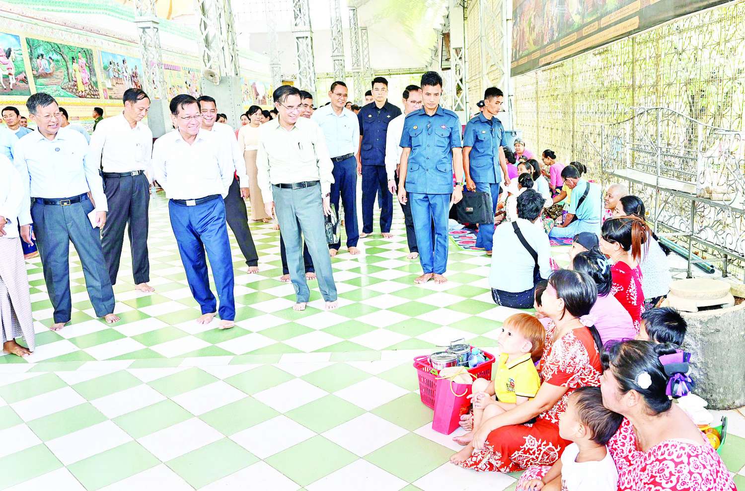 ထို့နောက် စေတီတော်မြတ်ကြီးအား လက်ယာရစ်လှည့်လည်ဖူးမြော်ကြည်ညိုကြပြီး တာဝန်ရှိသူများကို စေတီတော်မြတ်ကြီးနှင့် ပရိဝုဏ်တော်အတွင်းရှိ သာသနိကအဆောက်အအုံများ ရေရှည်တည်တံ့ခိုင်မြဲရေး၊ သန့်ရှင်းသပ်ရပ်ပြီး ကြည်ညိုသပ္ပာယ်ဖွယ်ဖြစ်စေရေး စဉ်ဆက်မပြတ် ထိန်းသိမ်းစောင့်ရှောက်သွားရန်လိုကြောင်း၊ ဘုရားဖူးလာ မိဘပြည်သူများ နေပူဒဏ်သက်သာစွာဖြင့် ဘုရားဖူးမြော်ကြည်ညိုနိုင်ရေးအတွက် တပ်မတော်(ကြည်း၊ ရေ၊ လေ)မိသားစုများက စေတီတော်ရင်ပြင်တော်အပြည့် စကျင်ကျောက်ပြားခင်းကျင်း ကပ်လှူလှူဒါန်းပေးသွားမည်ဖြစ်ကြောင်း၊ ထိုသို့ ဆောင်ရွက်ရာတွင်လည်း ရေဝင်ရေထွက်နေရာများ စနစ်တကျပါရှိစေရေး ဆောင်ရွက်သွားရန်လိုကြောင်းနှင့် လုပ်ငန်းဆောင်ရွက်မှုများအား အမြန်ဆုံးပြီးစီးအောင် ကြပ်မတ်ဆောင်ရွက်ပေးသွားရန်လိုကြောင်း မှာကြားခဲ့ပြီး ဘုရားဖူးလာ မိဘပြည်သူများအား ရင်းရင်းနှီးနှီး နှုတ်ဆက်ခဲ့သည်။