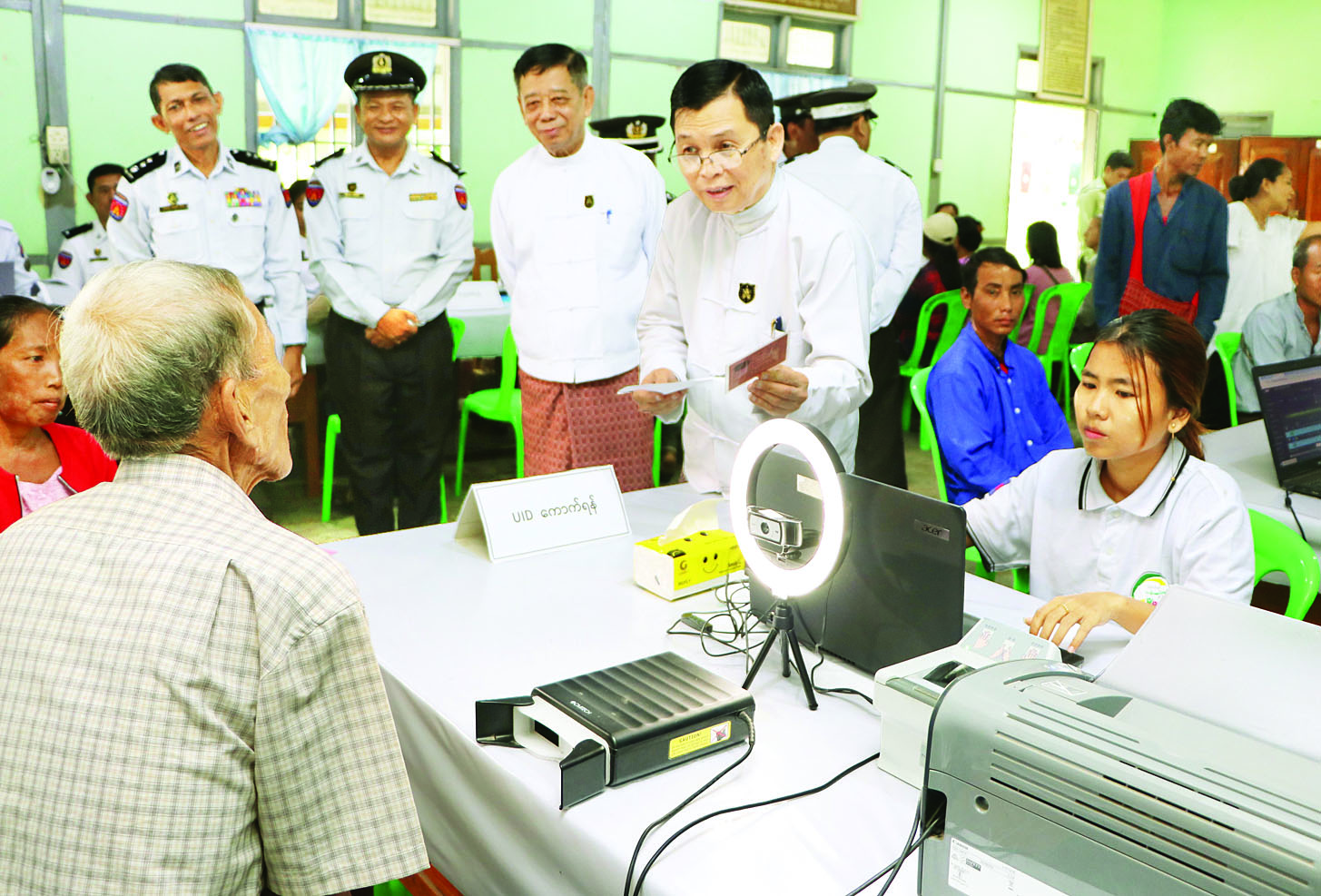 ထို့နောက် ဝန်ထမ်းများက အိမ်ထောင်စုလူဦးရေစာရင်းနှင့် နိုင်ငံသားစိစစ်ရေးကတ်ပြားထုတ်ပေးနိုင်ရေးအတွက် One Stop Service ဖြင့် လုပ်ငန်းစဉ်အဆင့်ဆင့် ဆောင်ရွက်နေမှုကိုလည်းကောင်း၊ နိုင်ငံသားစိစစ်ရေးကတ်ပြားရရှိပြီးသူများကို e-ID စနစ်ဖြင့် Biographic/ Biometric ကောက်ယူကာ Unique ID နံပါတ် တစ်ပါတည်း ဆောင်ရွက်ထုတ်ပေးနေမှုကိုလည်းကောင်း လှည့်လည်ကြည့်ရှုအားပေးကာ တာဝန်ရှိသူများအား လုပ်ငန်းလိုအပ်ချက်များ မှာကြားဖြည့်ဆည်းဆောင်ရွက်ပေးသည်။