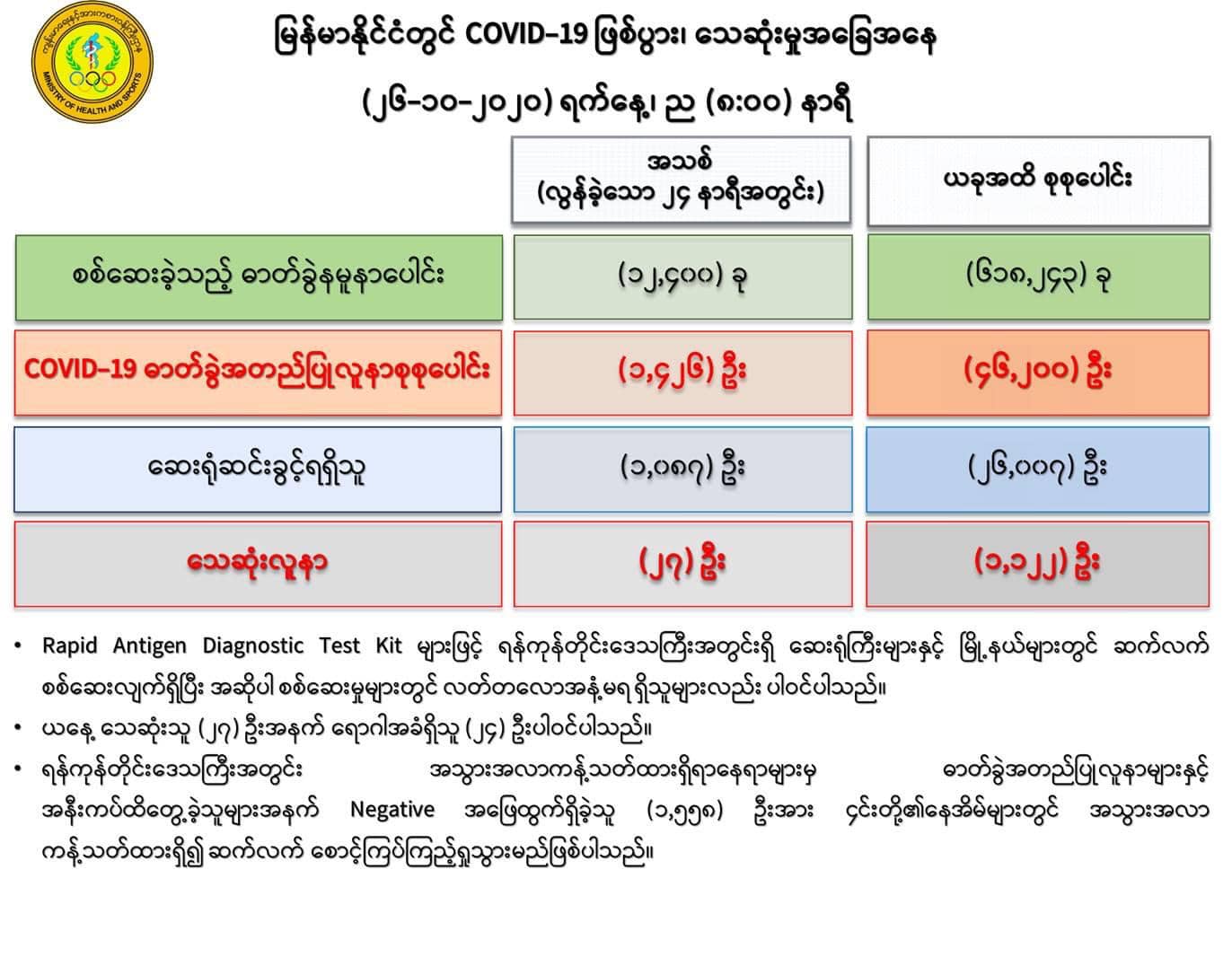 (၂၅-၁၀-၂၀၂၀) ရက်နေ့၊ ည (၈:၀၀) နာရီမှ (၂၆-၁၀-၂၀၂၀) ရက်နေ့၊ ည (၈:၀၀) နာရီ အတွင်း ဓာတ်ခွဲနမူနာ စုစုပေါင်း (၁၂,၄၀၀) ခုအား စစ်ဆေးပြီးစီးခဲ့ရာ COVID-19 ရောဂါ ဓာတ်ခွဲ အတည်ပြု လူနာသစ် (၁,၄၂၆)ဦး တွေ့ရှိရပါသည်။