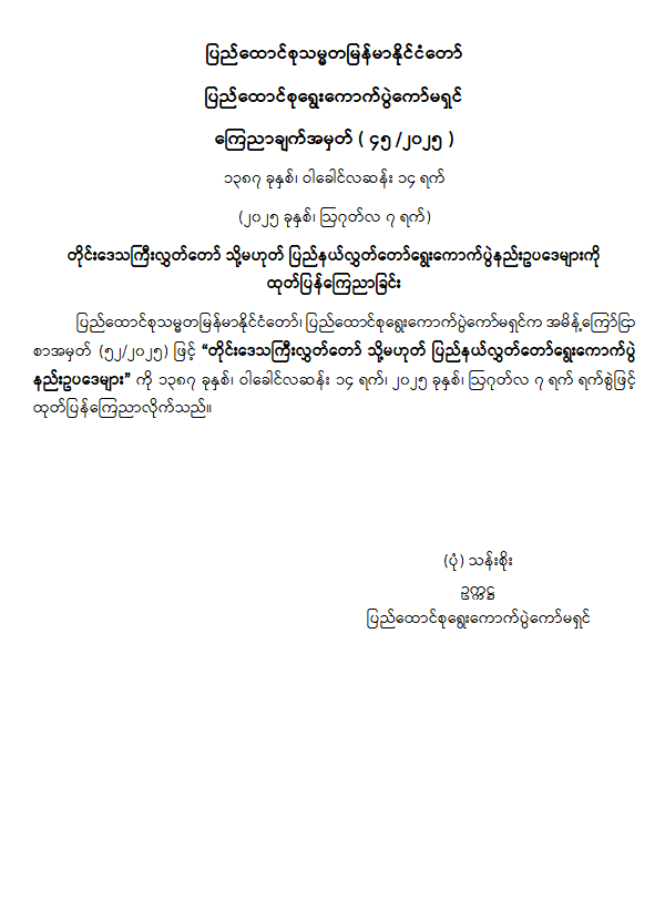 တိုင်းဒေသကြီးလွှတ်တော် သို့မဟုတ် ပြည်နယ်လွှတ်တော်ရွေးကောက်ပွဲနည်းဥပဒေများကို ထုတ်ပြန်ကြေညာခြင်း 08/07/2025