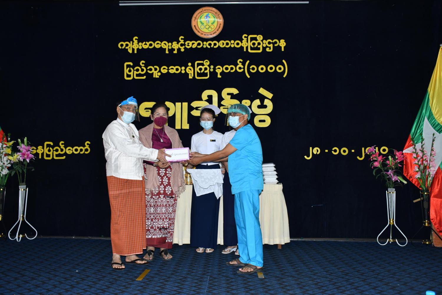 ယင်းနောက် တိုင်းရင်းသားလူမျိုးများရေးရာဝန်ကြီးဌာန ပြည်ထောင်စုဝန်ကြီး နိုင်သက်လွင်နှင့်ဇနီး မိကျင်သန်းတို့က ဝန်ကြီးဌာနမိသားစုတို့မှ လှူဒါန်း သော နေပြည်တော် ပြည်သူ့ဆေးရုံကြီး (ခုတင်-၁၀၀၀)ရှိ COVID-19 ICU အခန်းအတွက် ငွေကျပ်သိန်း (၃၀) တန်ဖိုးရှိ ရေခဲသေတ္တာ(၁)လုံးနှင့် လေအေးပေးစက် (၄)လုံးတို့ကို ပေးအပ် လှူဒါန်းရာ နေပြည် တော် ပြည်သူ့ဆေးရုံကြီး (ခုတင်-၁၀၀၀)မှ ဒုတိယ ဆေးရုံအုပ်ကြီး၊ ဆေးရုံအုပ်ကြီး ပူးတွဲ တာဝန် ဒေါက်တာအောင်လင်းအေး က လက်ခံရယူပြီး ဂုဏ်ပြုမှတ်တမ်းလွှာ ပြန်လည် ပေးအပ်သည်။