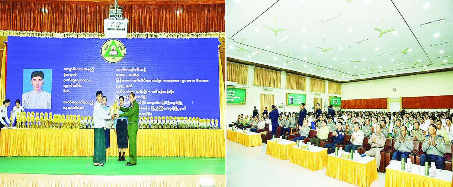 ယနေ့အခမ်းအနားတွင် ပြည်ထဲရေးဝန်ကြီးဌာန ကွပ်ကဲမှုအောက်ရှိ တပ်ဖွဲ့/ဦးစီးဌာနများမှ အရာထမ်း၊ အမှုထမ်းများ၏ သား/သမီး၊ ကျောင်းသား ကျောင်းသူများအနက် အသက်မွေးဝမ်းကျောင်း တက္ကသိုလ်များသို့ တက်ရောက်နေကြသူ ၅၃ ဦးနှင့် ၂ဝ၂၄-၂ဝ၂၅ ပညာသင်နှစ် တက္ကသိုလ်ဝင်စာမေးပွဲတွင် ထူးချွန်စွာအောင်မြင်ခဲ့ကြသော ခြောက်ဘာသာဂုဏ်ထူးရှင်ရှစ်ဦး၊ ငါးဘာသာဂုဏ်ထူးရှင် ၁၅ ဦး၊ လေးဘာသာဂုဏ်ထူးရှင် ၃၄ ဦး၊ သုံးဘာသာဂုဏ်ထူးရှင် ၁၀၁ ဦး၊ နှစ်ဘာသာဂုဏ်ထူးရှင် ၉၈ ဦး၊ တစ်ဘာသာဂုဏ်ထူး ရှင် ၁၅၅ ဦး စုစုပေါင်း ဂုဏ်ထူးရှင် ၄၁၁ ဦး၊ ရိုးရိုးအောင်မြင်သူ ၈၈၁ ဦးတို့ကို ပညာရည်ချွန်ဆုများနှင့် ပညာသင်စရိတ်များ ဂုဏ်ပြုချီးမြှင့်ပေးခဲ့ကြောင်း သိရသည်။