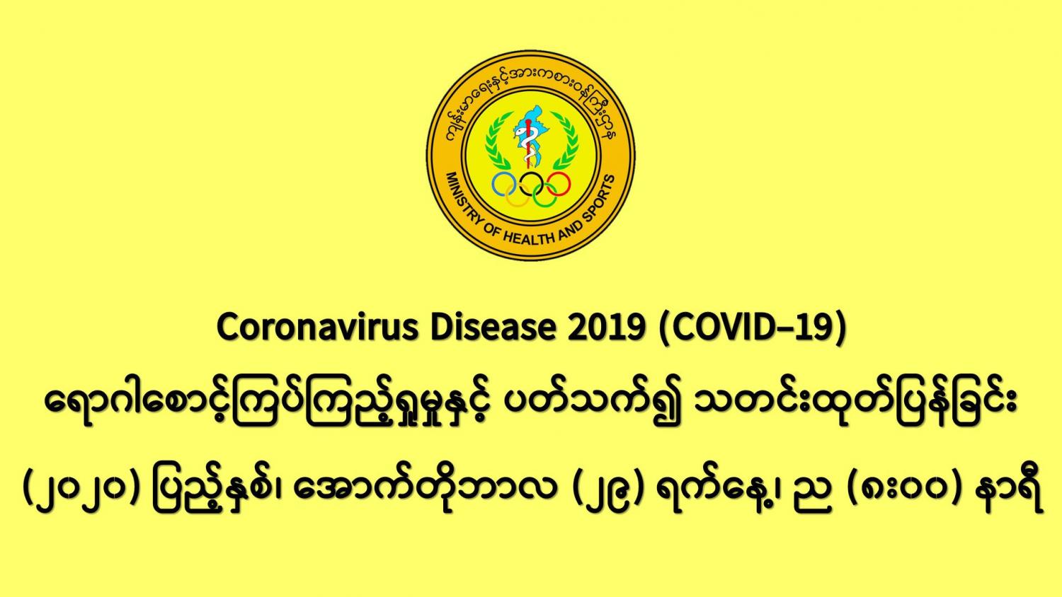 (၂၈-၁၀-၂၀၂၀) ရက်နေ့၊ ည (၈:၀၀) နာရီမှ (၂၉-၁၀-၂၀၂၀) ရက်နေ့၊ ည (၈:၀၀) နာရီ အတွင်း ဓာတ်ခွဲနမူနာ စုစုပေါင်း (၁၄,၂၅၂) ခုအား စစ်ဆေးပြီးစီးခဲ့ရာ COVID-19 ရောဂါ ဓာတ်ခွဲ အတည်ပြု လူနာသစ်(၁,၃၃၁)ဦး တွေ့ရှိရပါသည်။