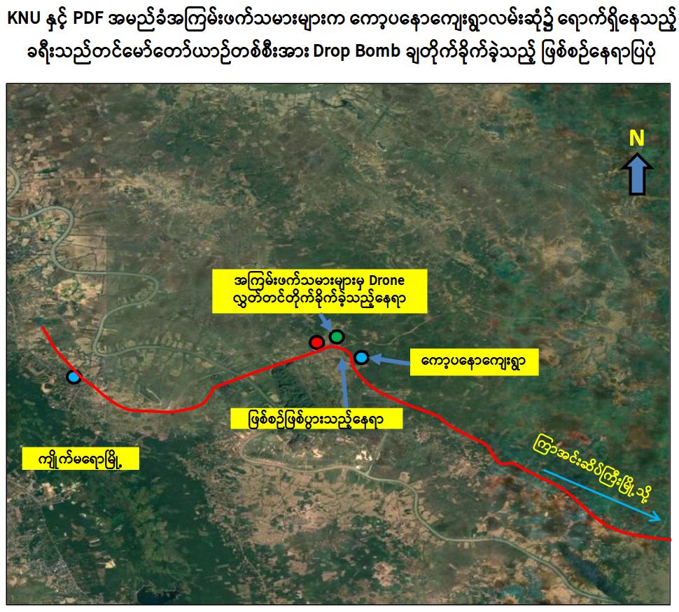 ထိုသို့ လုပ်ဆောင်လျက်ရှိရာ KNU နှင့် PDF အမည်ခံအကြမ်းဖက်သမားများသည် ကျိုက်မရောမြို့နယ်၊ ကော့ပနောကျေးရွာလမ်းဆုံတွင် ရောက်ရှိနေသော ခရီးသည်တင်မော်တော်ယာဉ်တစ်စီးအား စက်တင်ဘာလ ၂ ရက်နေ့တွင် Drop Bomb ချ တိုက်ခိုက်ခဲ့သဖြင့် ယာဉ်မောင်းအပါအဝင် ခရီးသည်အမျိုးသား ၉ ဦး၊ အမျိုးသမီး ၂ ဦး၊ စုစုပေါင်း ၁၁ ဦးတို့တွင် ဗုံးစထိမှန်ဒဏ်ရာရရှိခဲ့ကြောင်း သိရှိရသည်။