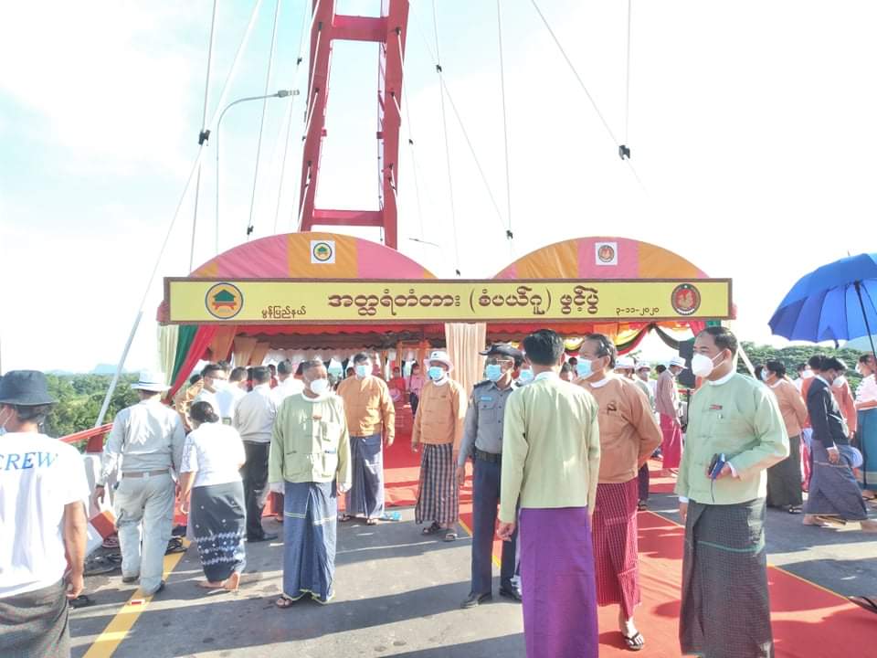 ဆက်လက်၍ မွန်ပြည်နယ်အစိုးရအဖွဲ့ဝင် ဝန်ကြီးချုပ် ဒေါက်တာအေးဇံကတံတားတည် ဆောက်ခြင်းနှင့် ပတ်သက်၍ ဆရာတော်များအား လျှောက်ထားတင်ပြကာရေစက်သွန်းချ အမျှပေးဝေခဲ့ကြသည်။ ထို့နောက် မွန်ပြည်နယ် ဝန်ကြီးချုပ် ဒေါက်တာအေးဇံနှင့်အစိုးရအဖွဲ့ဝင်ဝန်ကြီးများက တံတားကြီး၏ ကမ္ဗည်းမော်ကွန်းကျောက်စာတိုင်အား အမွှေးနံ့သာရည်များ ပက်ဖျန်းခဲ့ကြပြီး ဝန်ကြီးချုပ်နှင့်အဖွဲ့ မှ တံတားကြီးပေါ်မှ ဖြတ်သန်းကြည့်ရှု၍ တံတားကြီးအား ဖွင့်လှစ်ပေးခဲ့သည်။