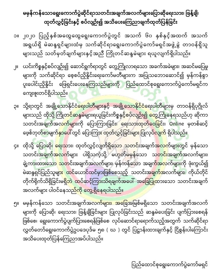 ၂။ ယင်းကိစ္စနှင့်စပ်လျဉ်း၍ ဆောင်ရွက်ရာတွင် တွေ့ကြုံလာရသော အခက်အခဲများ၊ အဆင် မပြေမှု များကို သက်ဆိုင်ရာ စေ့စပ်ညှိနှိုင်းရေးကော်မတီများက အပြု သဘောဆောင်၍ မှန်ကန်စွာ ပူးပေါင်းညှိနှိုင်း ဖြေရှင်းပေးနေကြသည်များကို ပြည်ထောင်စုရွေးကောက်ပွဲကော်မရှင်က ကျေးဇူးတင်ရှိပါ သည်။